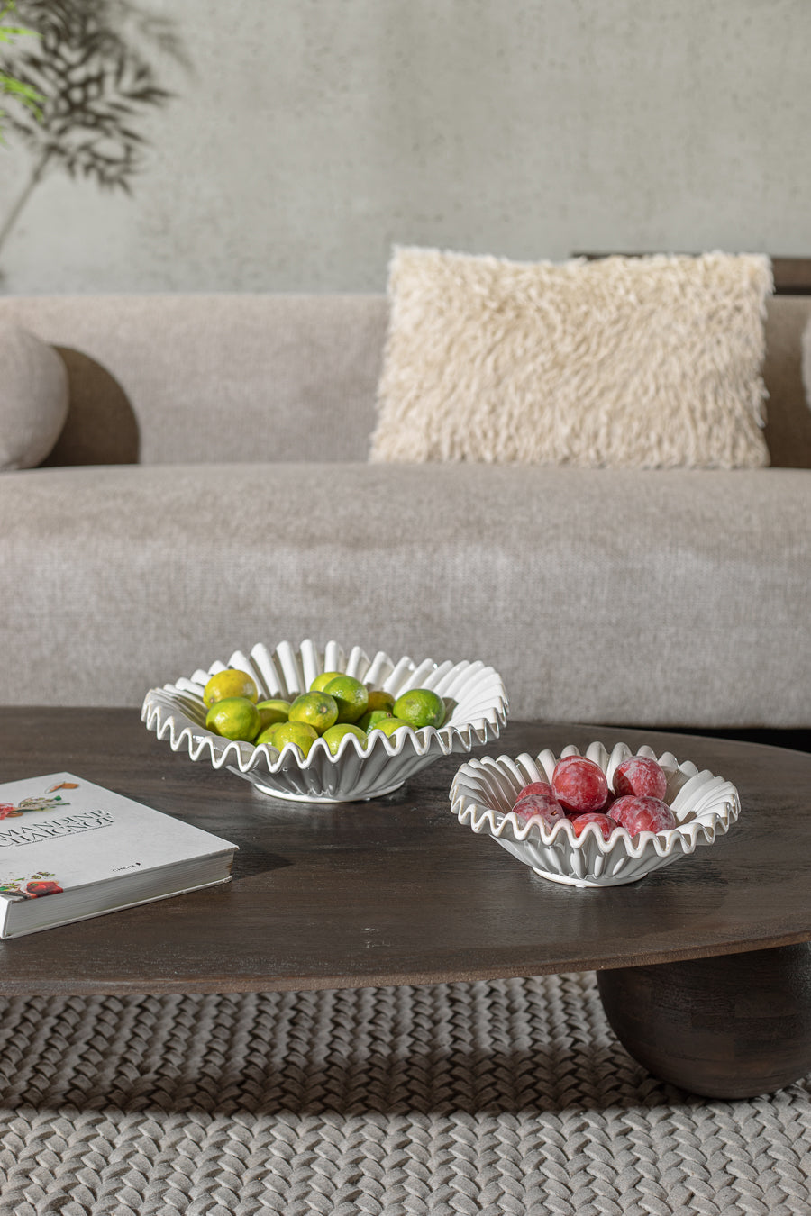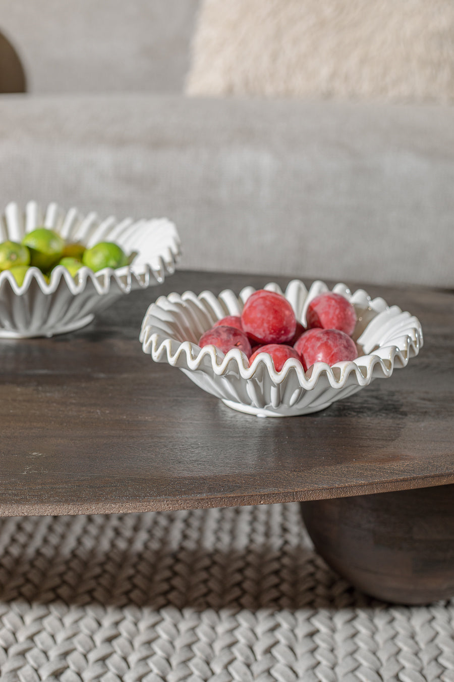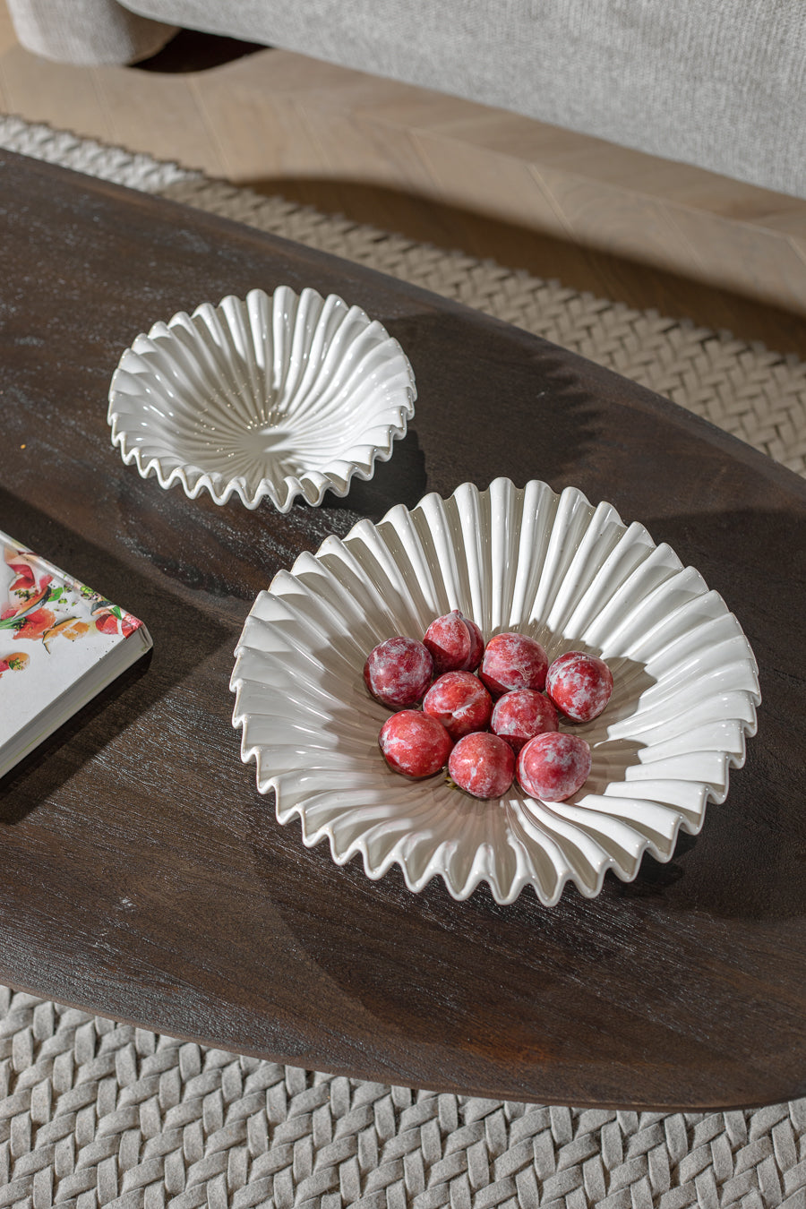 בול נאוטילוס בצבע לבן. קערת הגשה מפוסלת קפלים צפופים בגימור שייני.