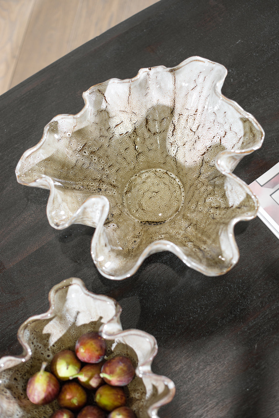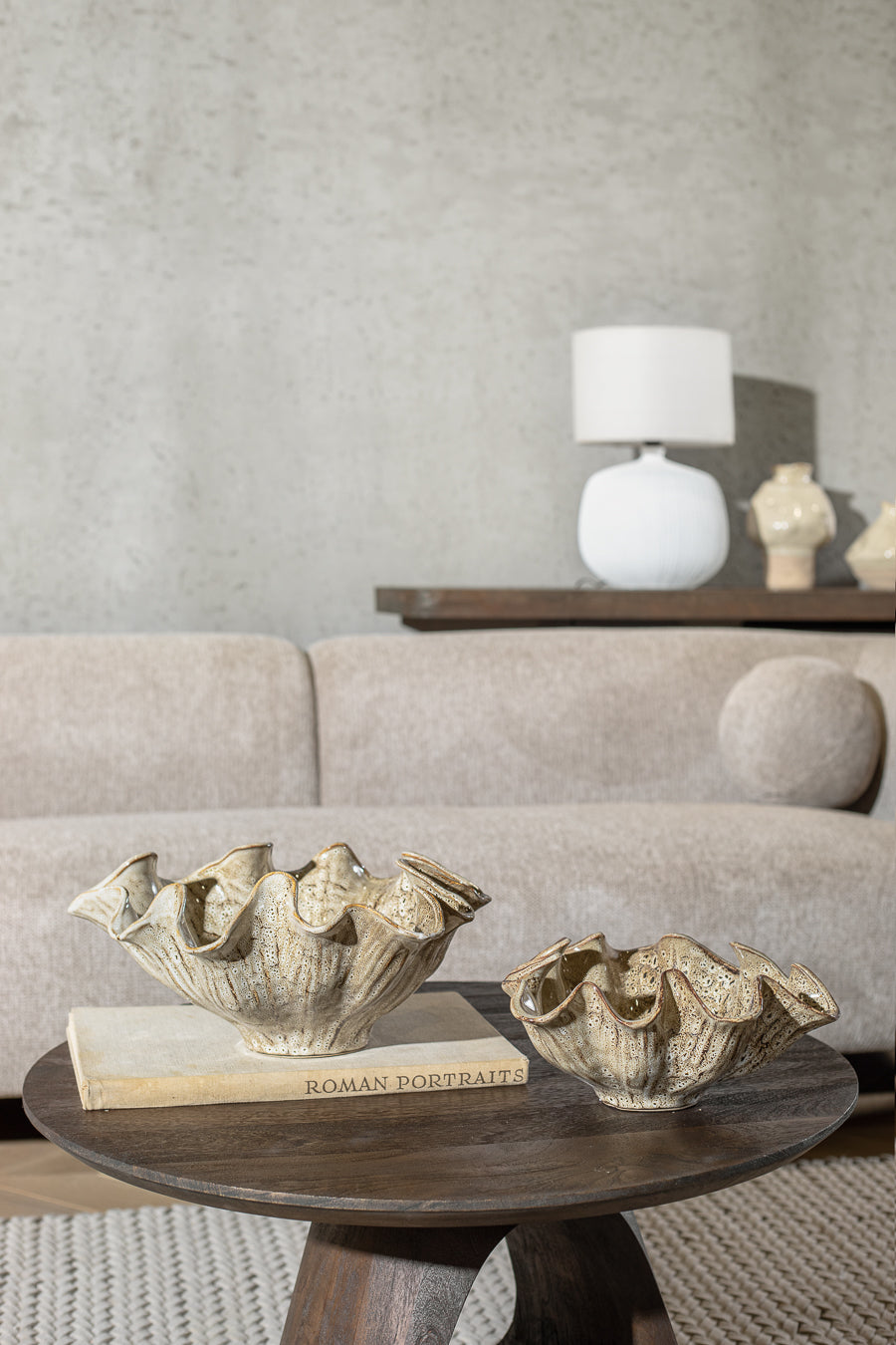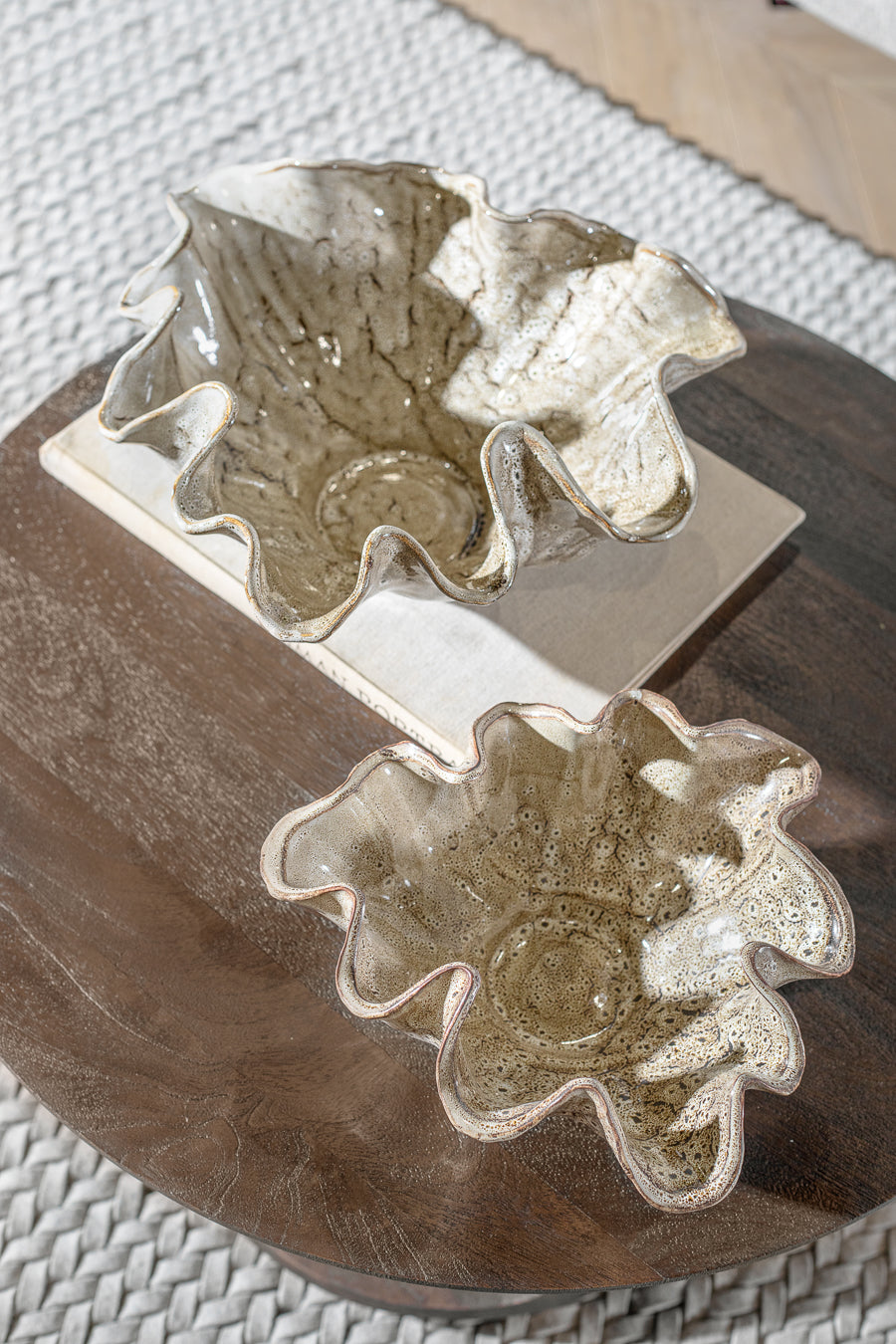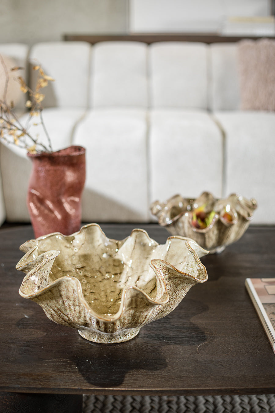 בול נאוטילוס בצבע חום. קערת הגשה מפוסלת קפלים בגימור שייני.