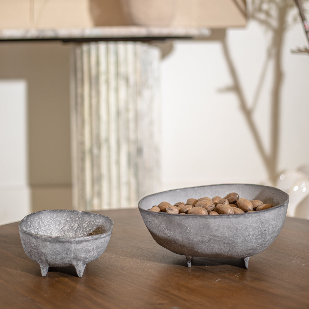 בול מתכת פורסט פרופיל דק בגוון אפור. קערת הגשה בעיצוב גוף קעור מעובד, הנישאת על זוג רגליים מלבניות בצבע זהה. אקססורי חובה לאוהבי שילוב אלמנטים קולור בלוק רך.