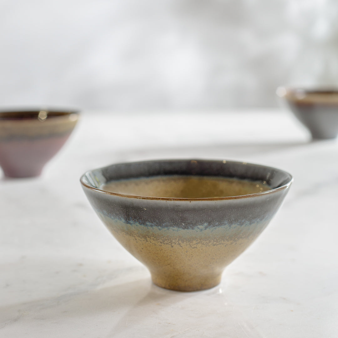 שישיית בול ריפלקשיין ראסט מאסטרד בלו. סט קערות פורצלן בגוון מתהווה משחור לזהב בצביעה ייחודית. קערות הגשה בעיצוב אל זמני, המשלימות לניראות שולחן מארח בקו fine.