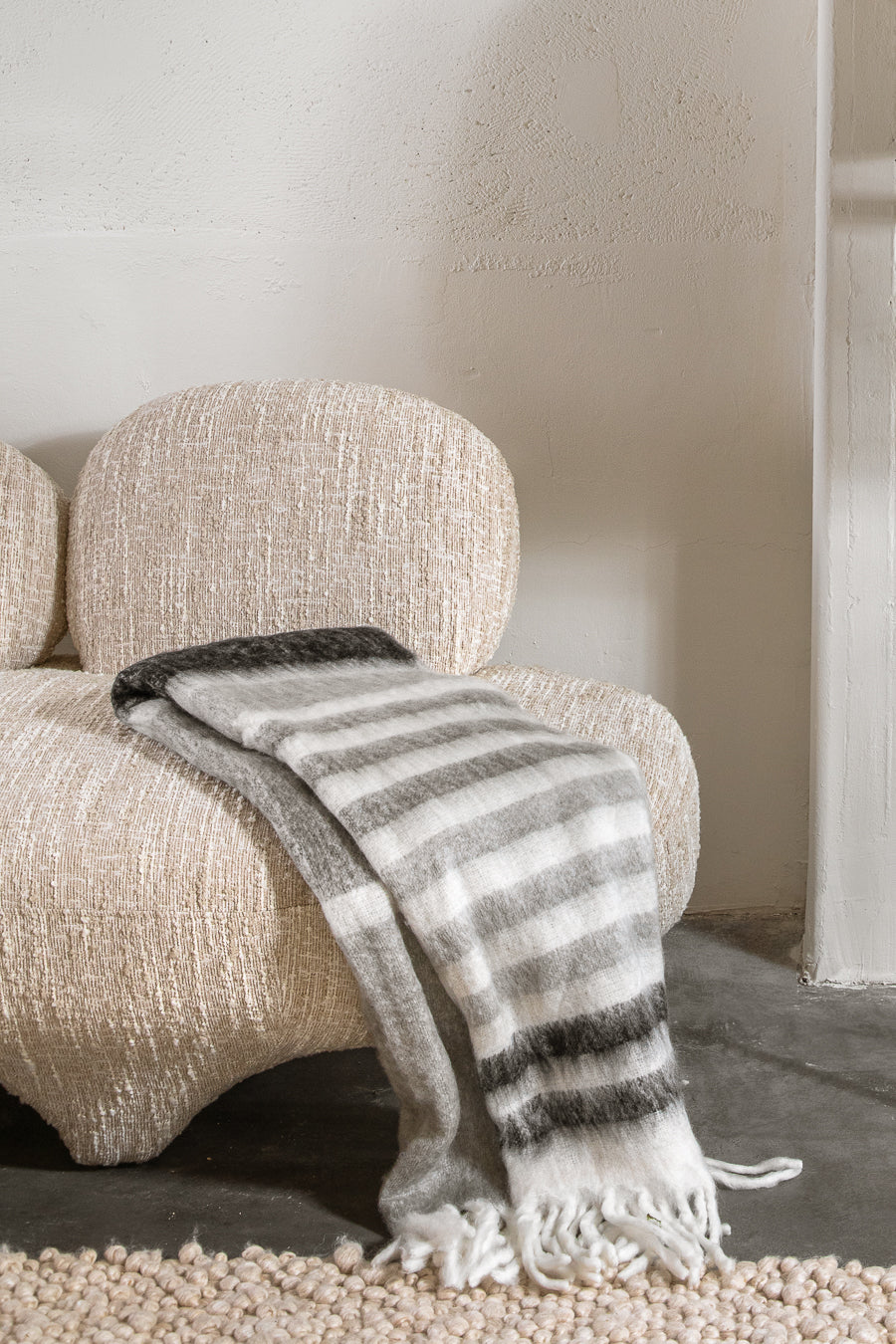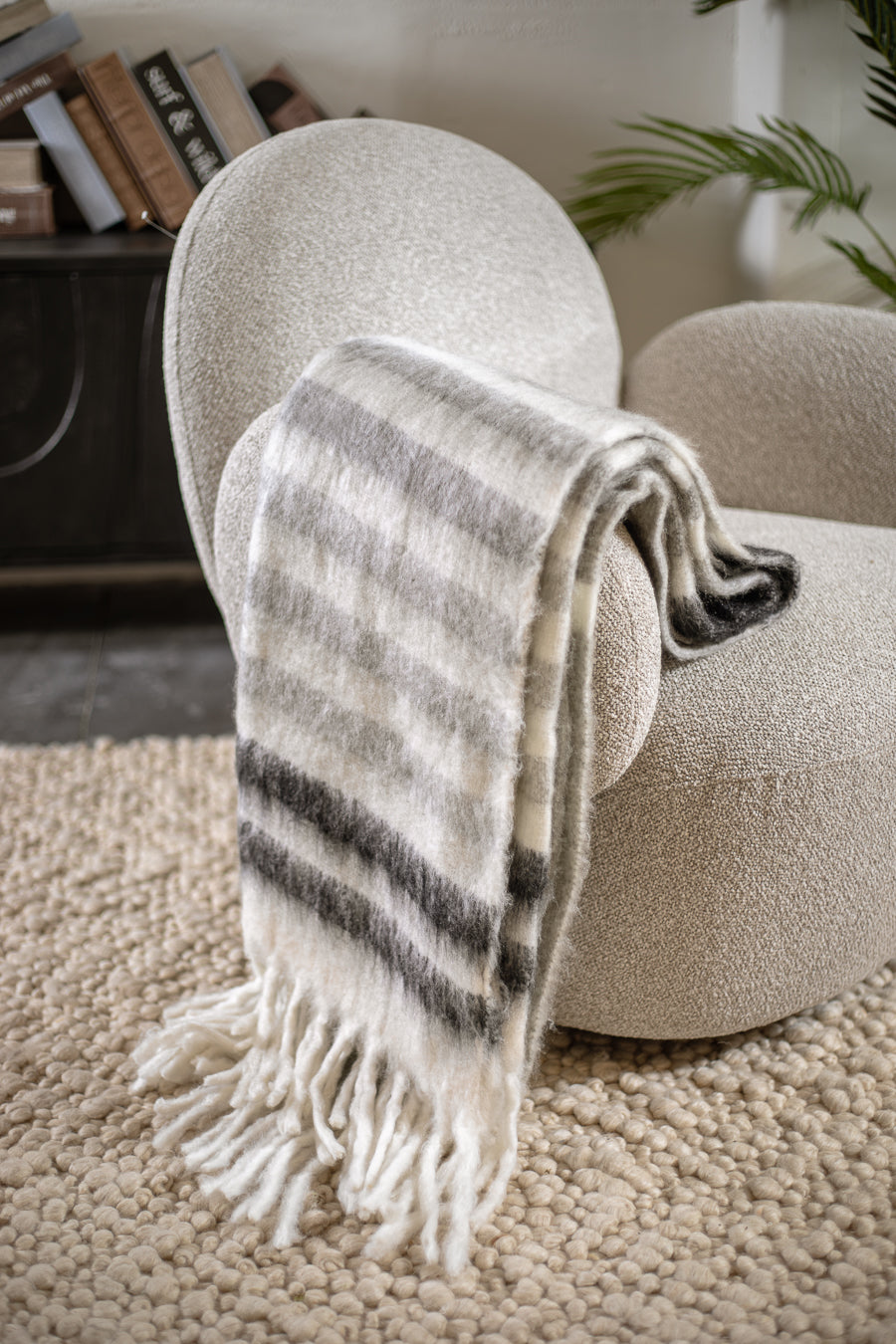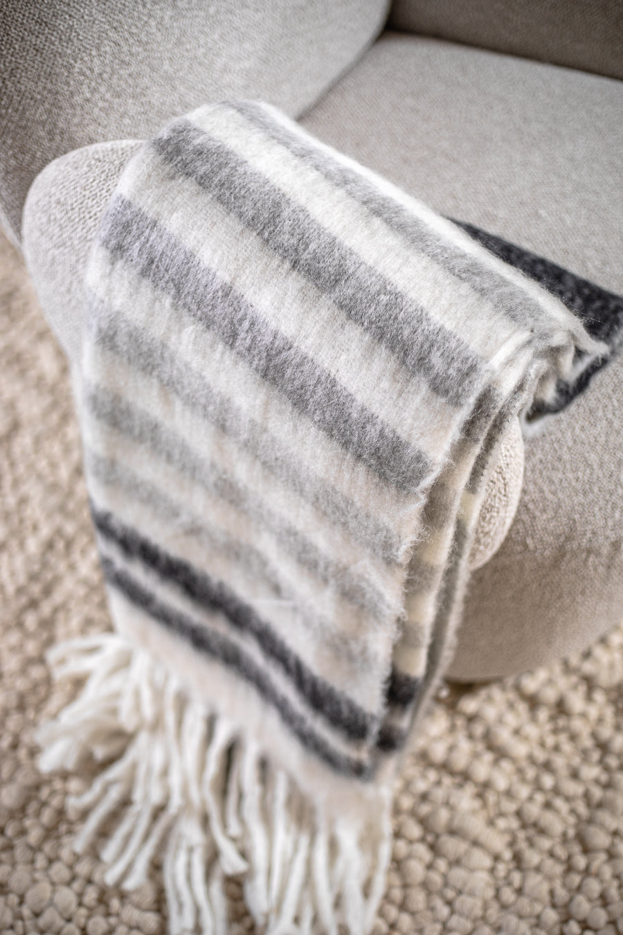 בלנקט סטרייפס בגווני אפור לבן. שמיכת טלוויזיה מפנקת, מעוצבת פסי רטרו ושוונצים בקצוות.