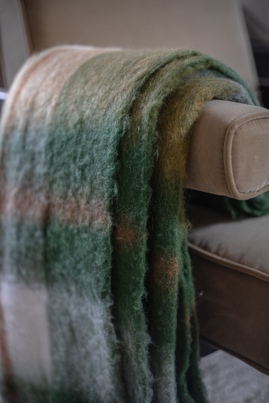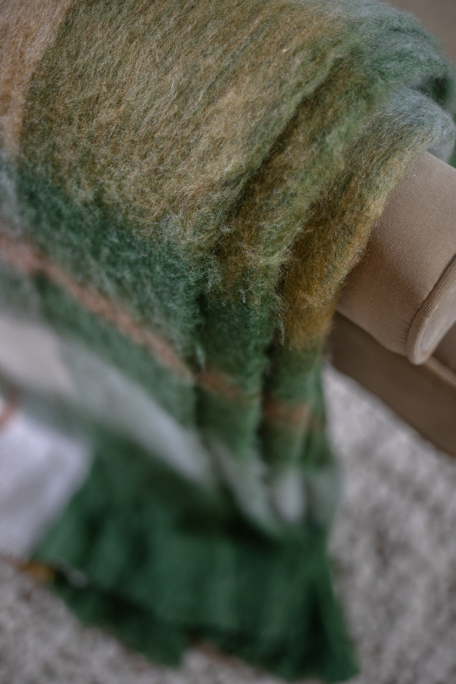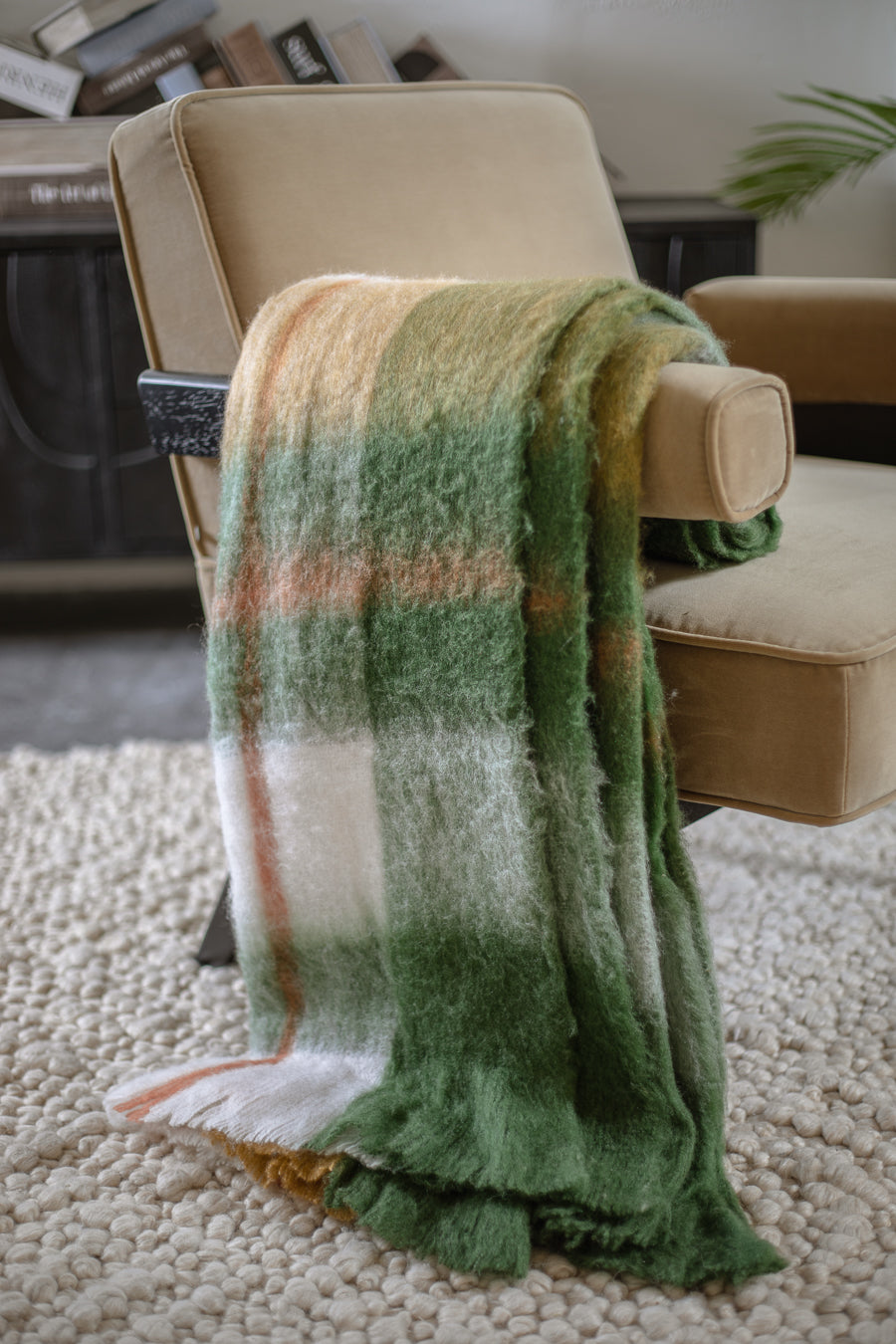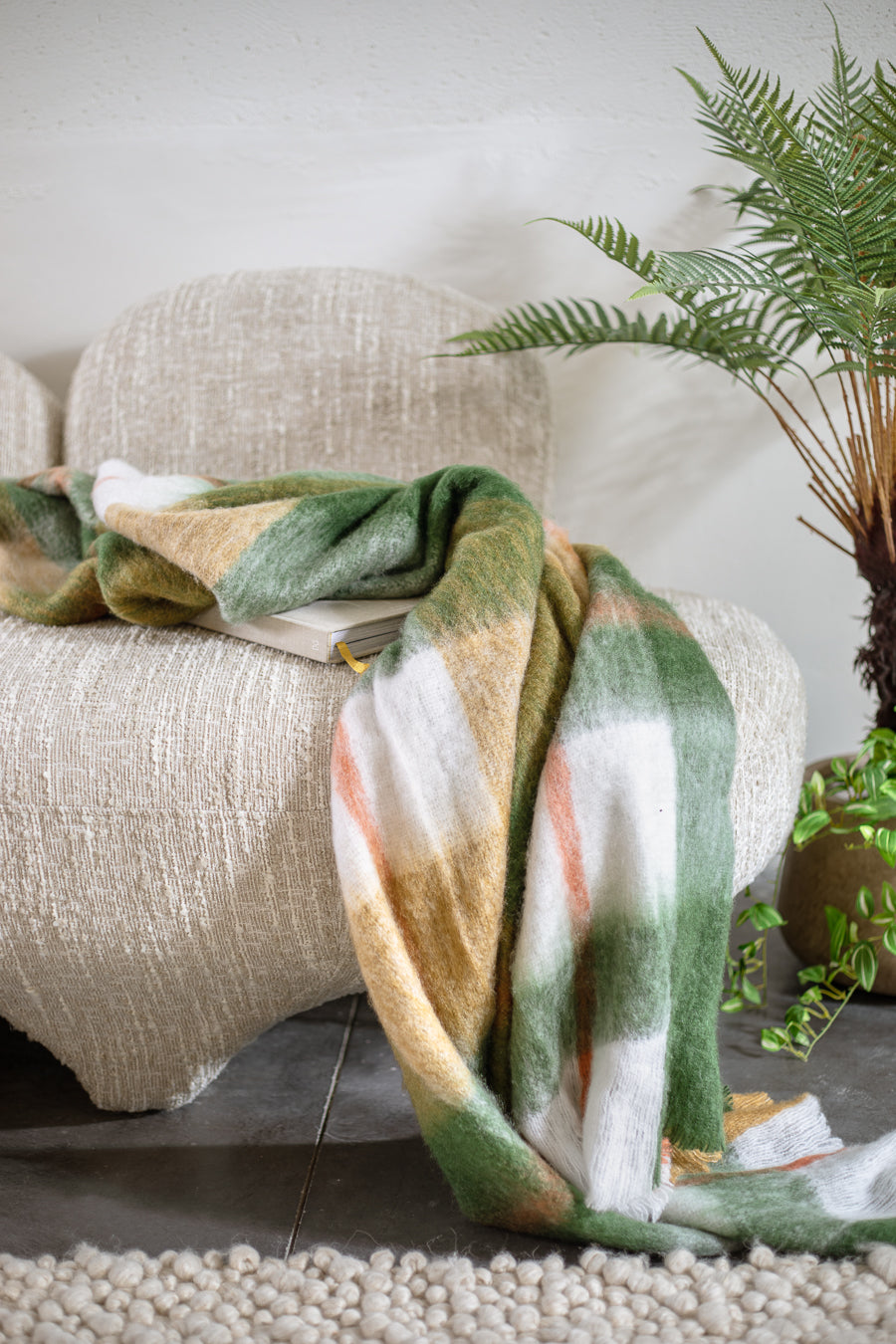 בלנקט סקוורס בגוונים חמים. שמיכת טלוויזיה מפנקת, מעוצבת משבצות רטרו ושוונצים בקצוות.