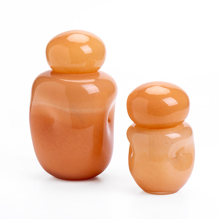 בקבוק זכוכית ארטי פרופיל אמורפי בצבע אמבר. כלי נוי בעיצוב ייחודי, לאיבזור חלל באלמנטים וצורות הלקוחים מהטבע. אקססורי בנגיעת צבע מעודנת, להשלמת נראות מדף בחלל המגורים או חדר השינה.