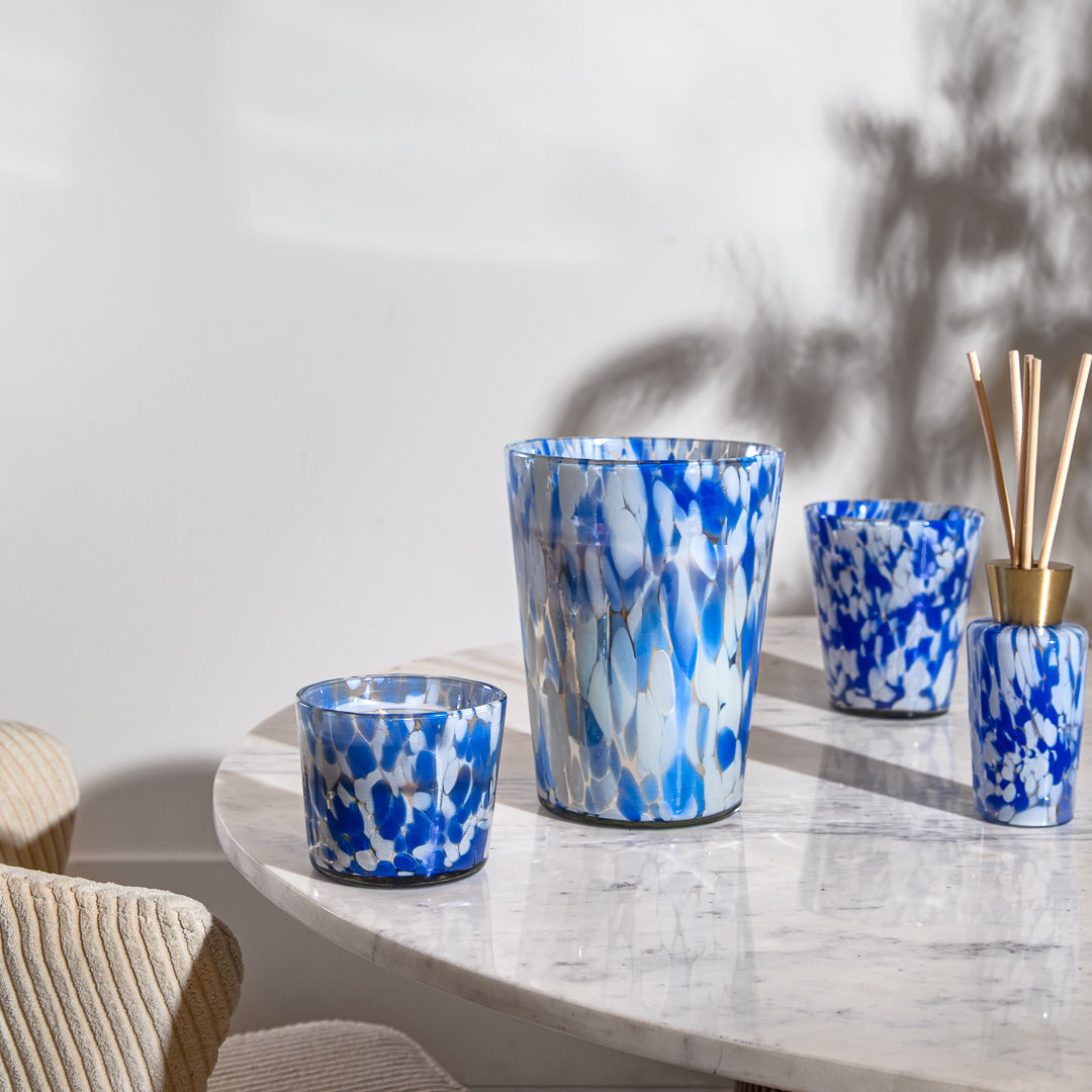 מפיץ ריח המגיע בבקבוקון זכוכית לאופרד לבן כחול ו-5 מקלות עץ ארוכים.