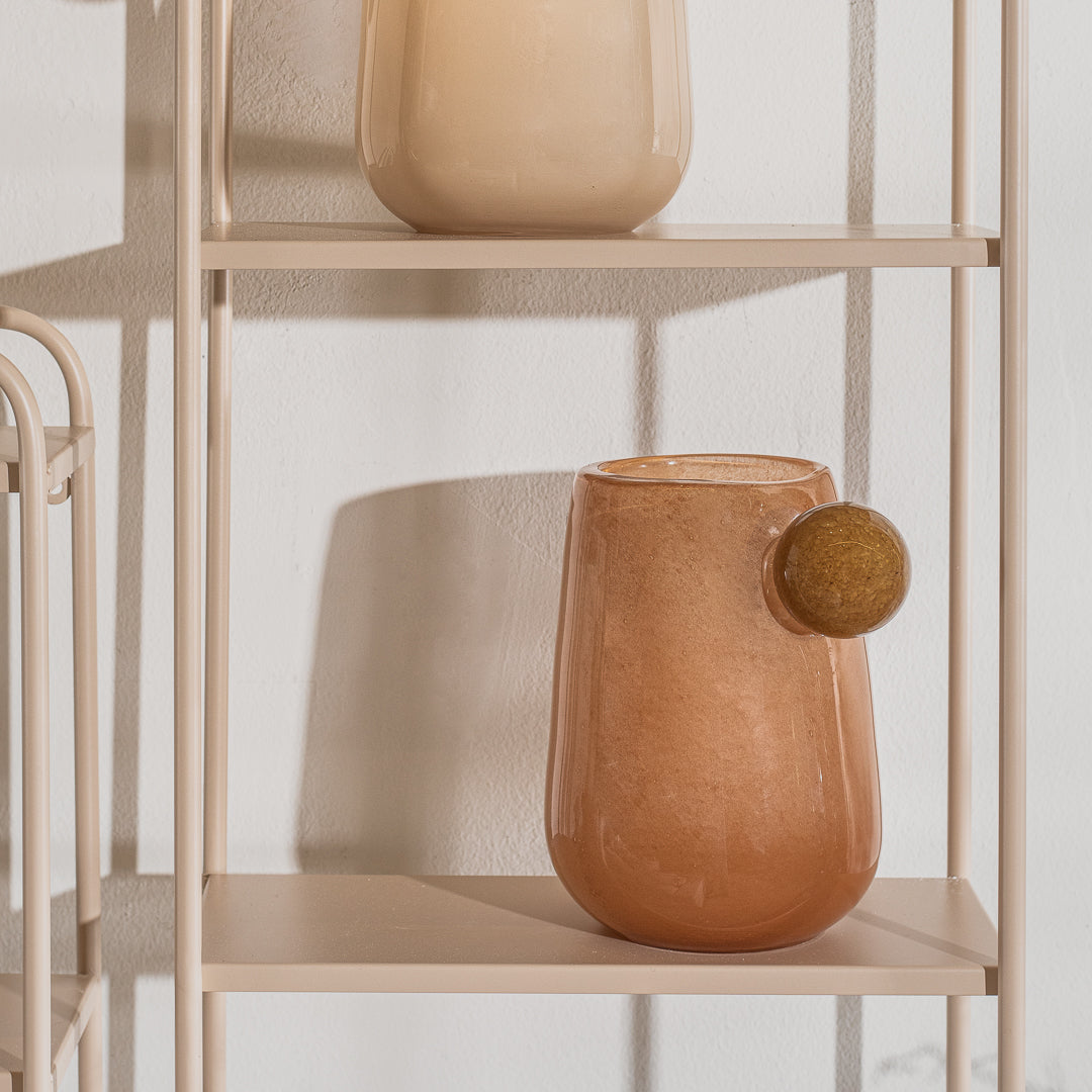 ואזה זכוכית ארטי בגוון כתום סמוק. אגרטל בעיצוב ייחודי, מעוצב גוף מאורך ואלמנטי כדורי בגוון אמבר.