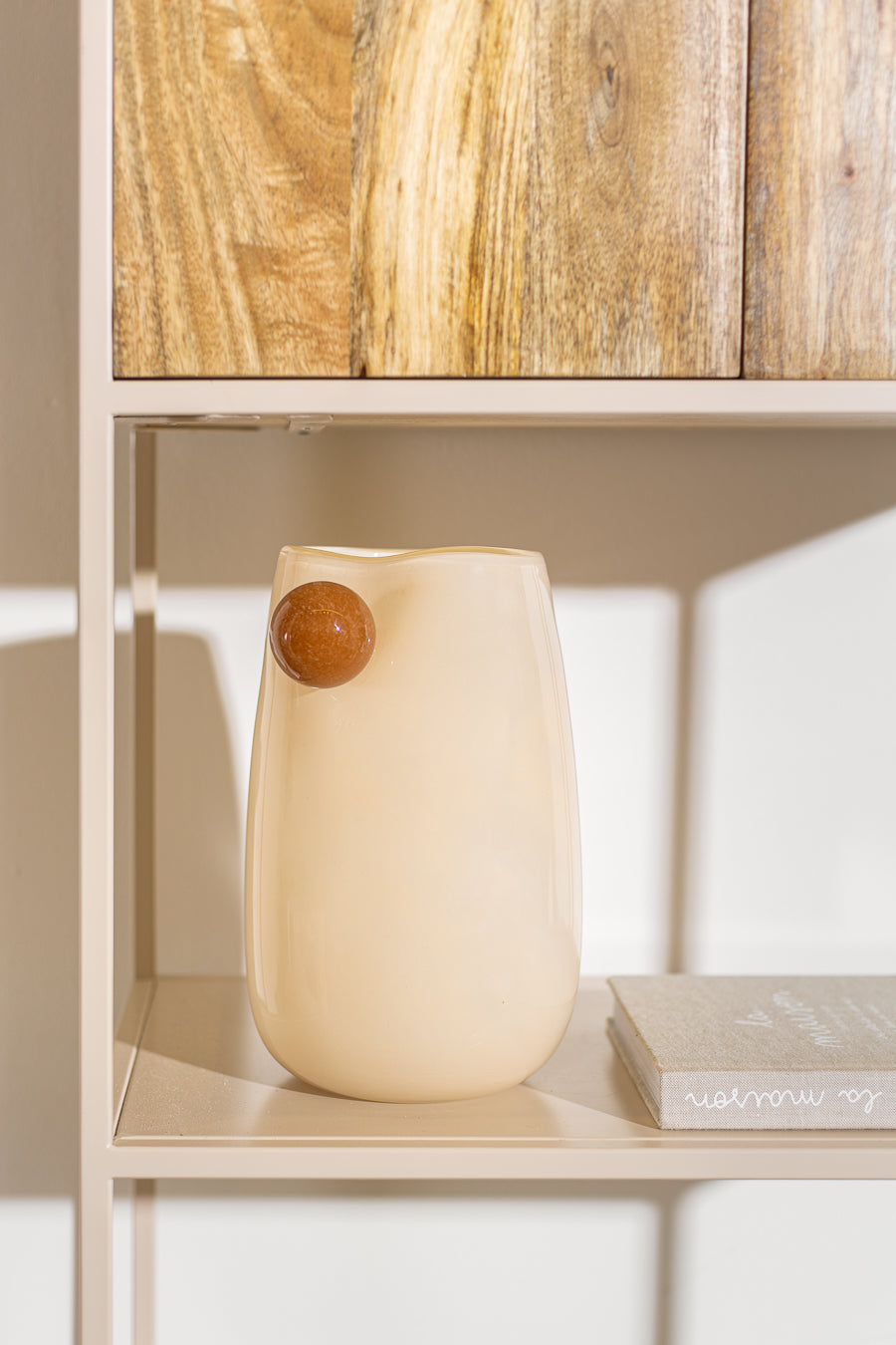 ואזה זכוכית ארטי בגוון לבן סמוק. אגרטל בעיצוב ייחודי, מעוצב גוף מאורך ואלמנט כדורי בגוון אמבר. ואזה זו היא פריט מסדרת ואזות "ארטי סמוק" שמומלץ לשלב ביניהם.
