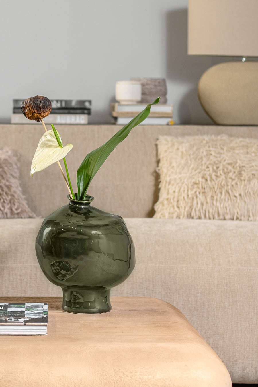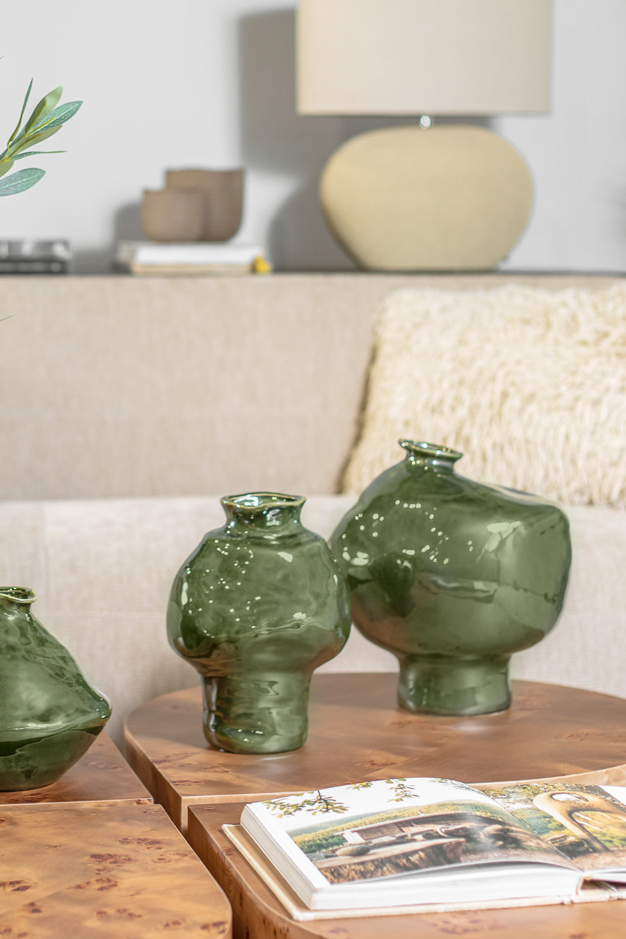 ואזה ארט אמורפית בגוון ירוק. אגרטל קרמיקה מעוצב קימורים בולטים, המתכתב עם עולמות העת העתיקה.