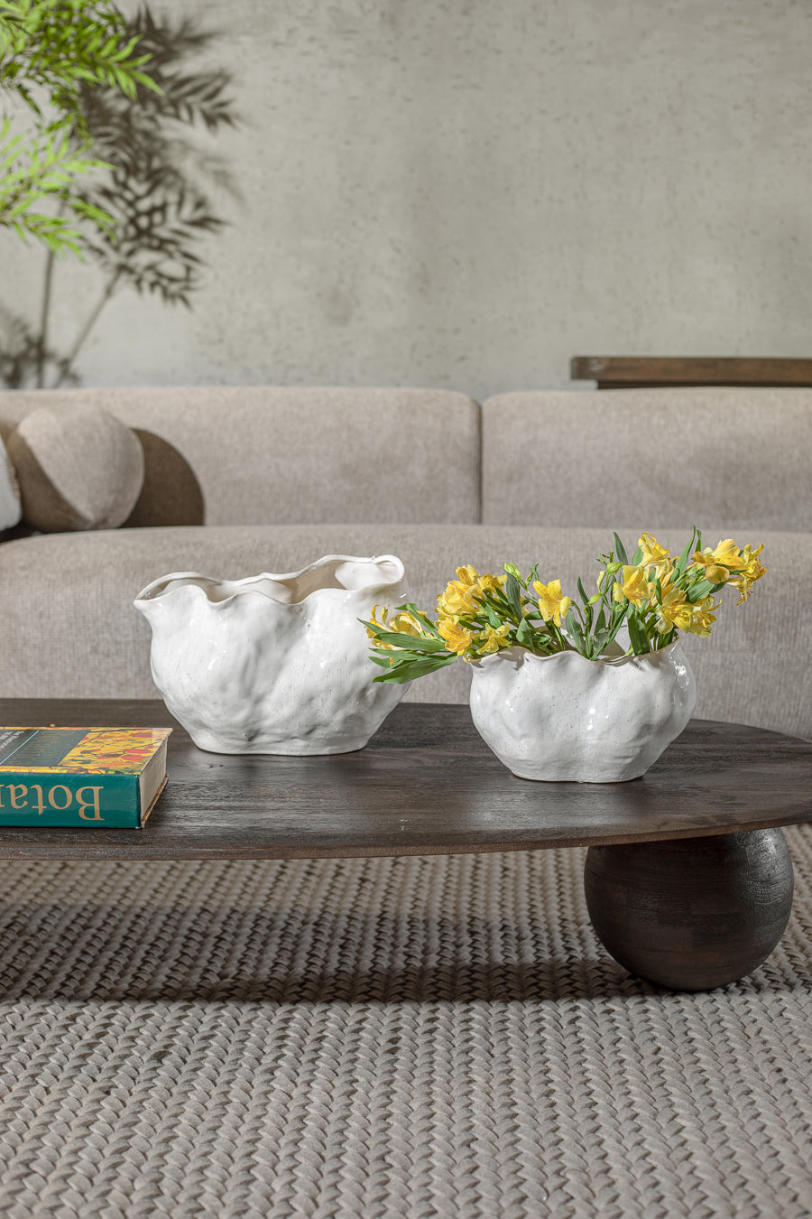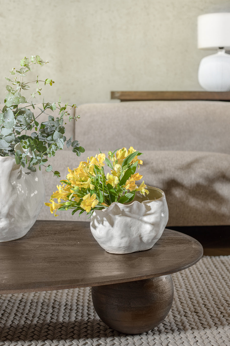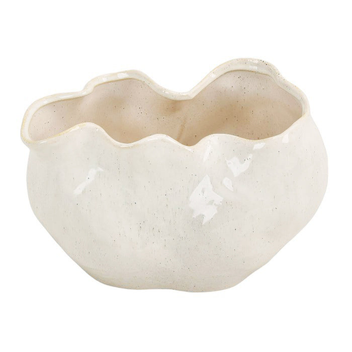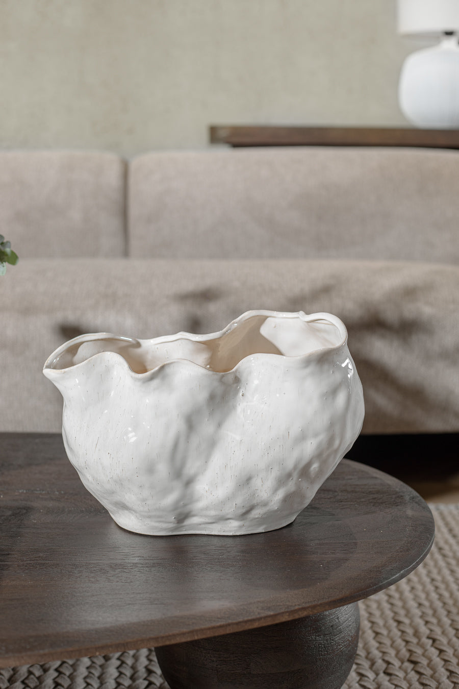 ואזה בלייז אמורפית בצבע לבן. אגרטל קרמיקה אבסטרקטי, מדמה תנועת טקסטיל רכה.