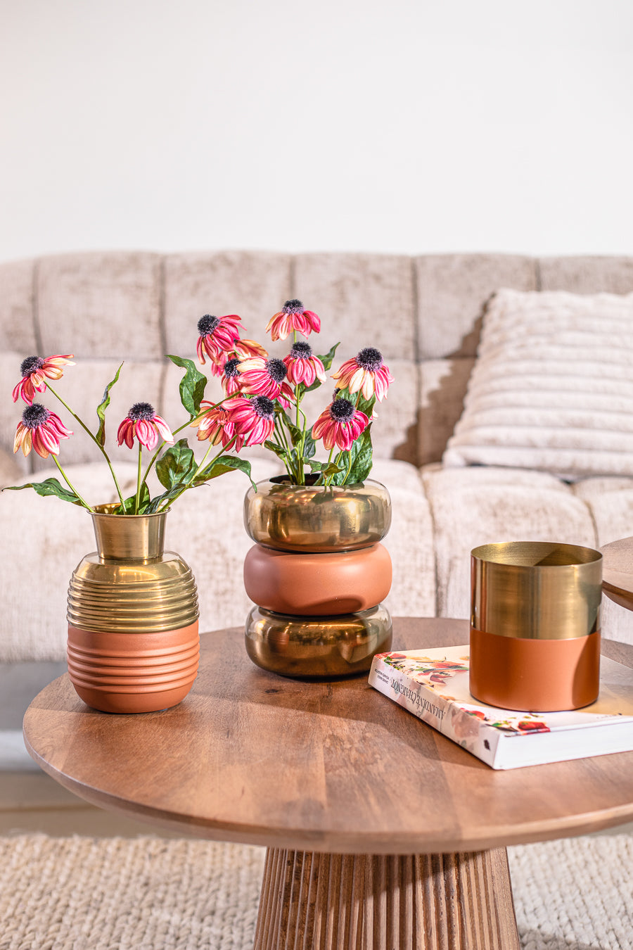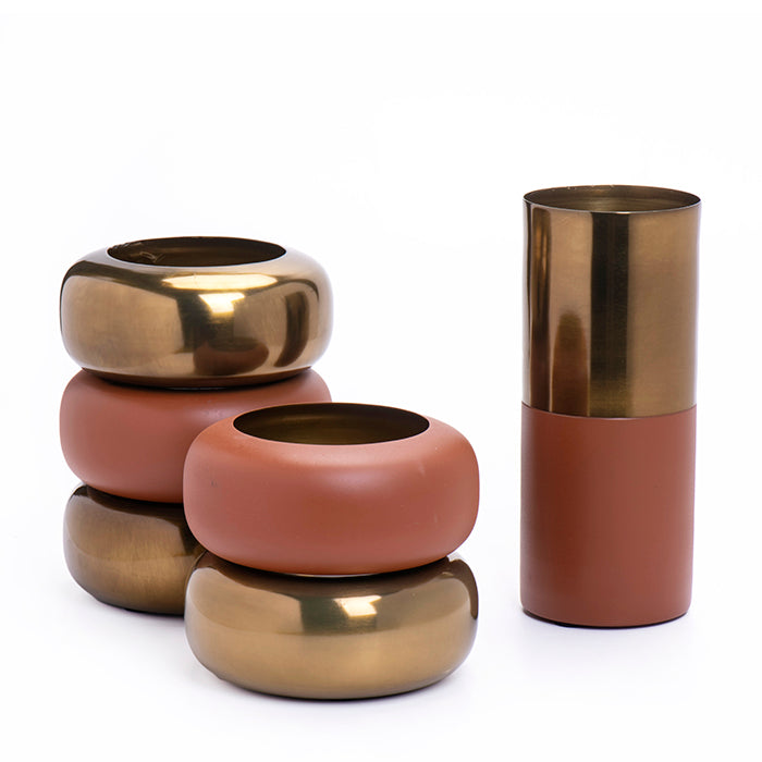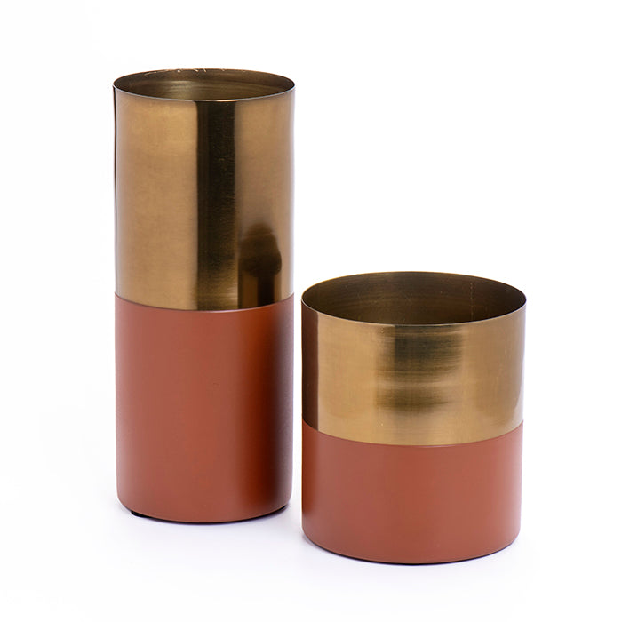 ואזה מתכת דאבל טון סילואט ארוך דק בצבעי זהב וטרה. אגרטל צילינדר מעוצב 2 צבעים ב- קו אורבני עכשווי.