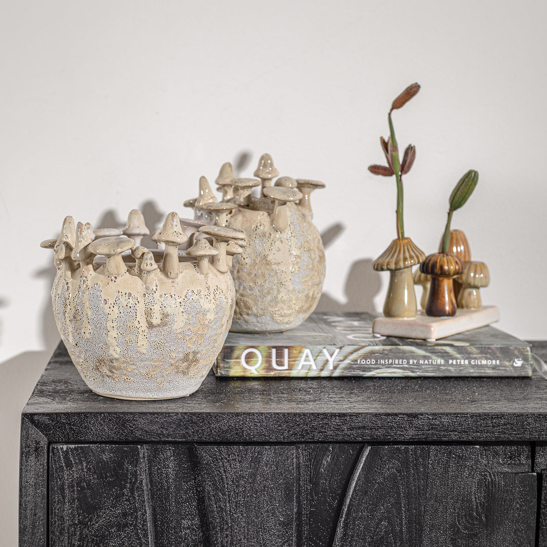 ואזה מאשרום ראונד בצבע בז'. אגרטל קרמיקה מעוצב צבר פטריות היקפי בגימור מחוספס.
