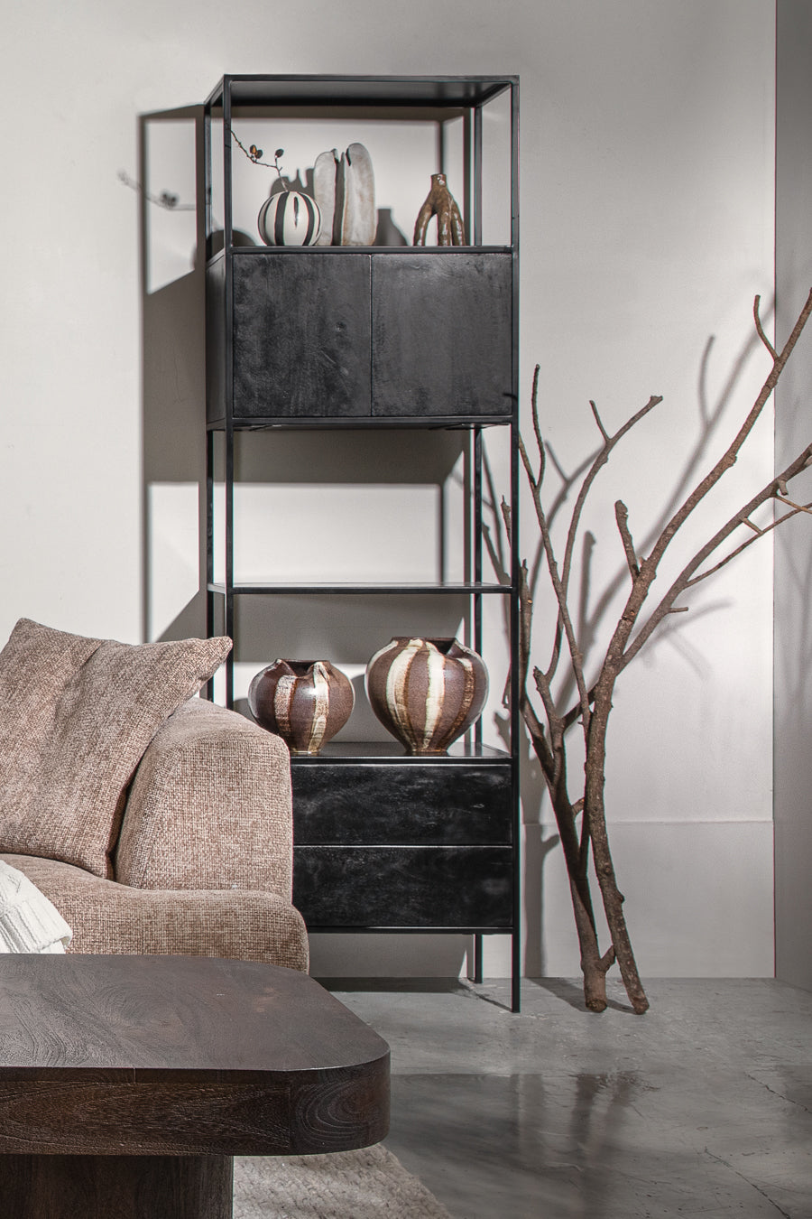 ואזה מונסון בשחור ולבן. אגרטל קרמיקה עגול בדיגום פסים אמורפים וגימור גלייז.