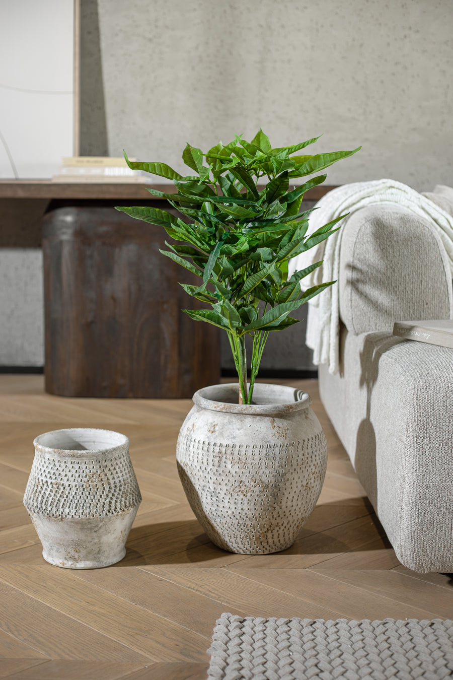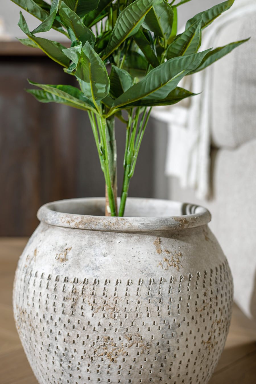 ואזה נבאדה אתנית בגוון אפרפר. אגרטל קרמיקה עגול מעוצב חירוץ פיסולי ייחודי.