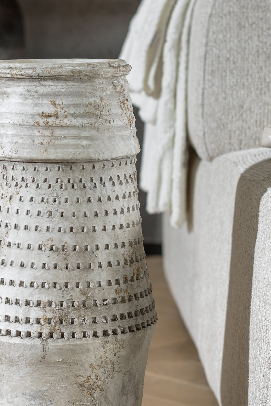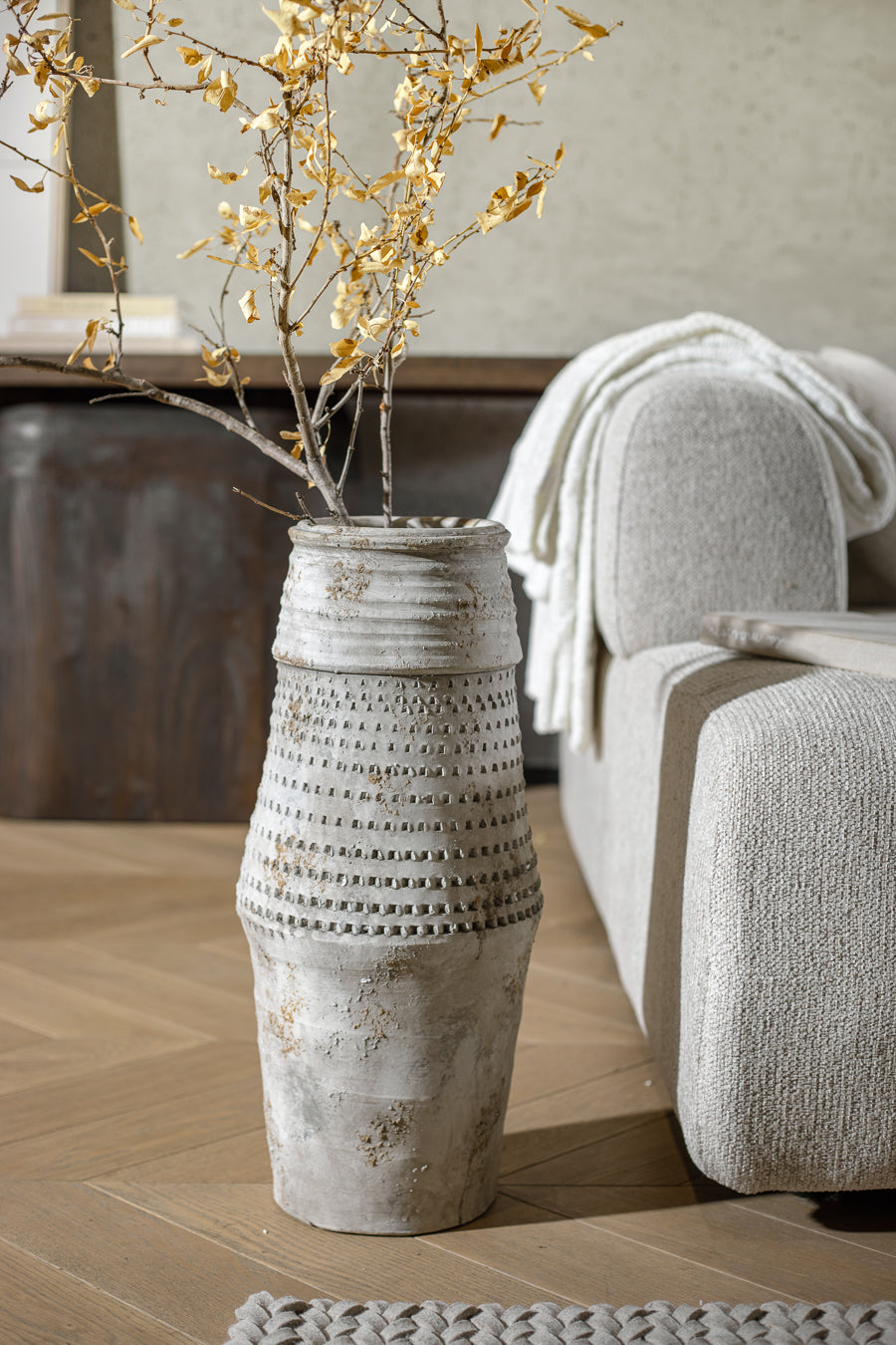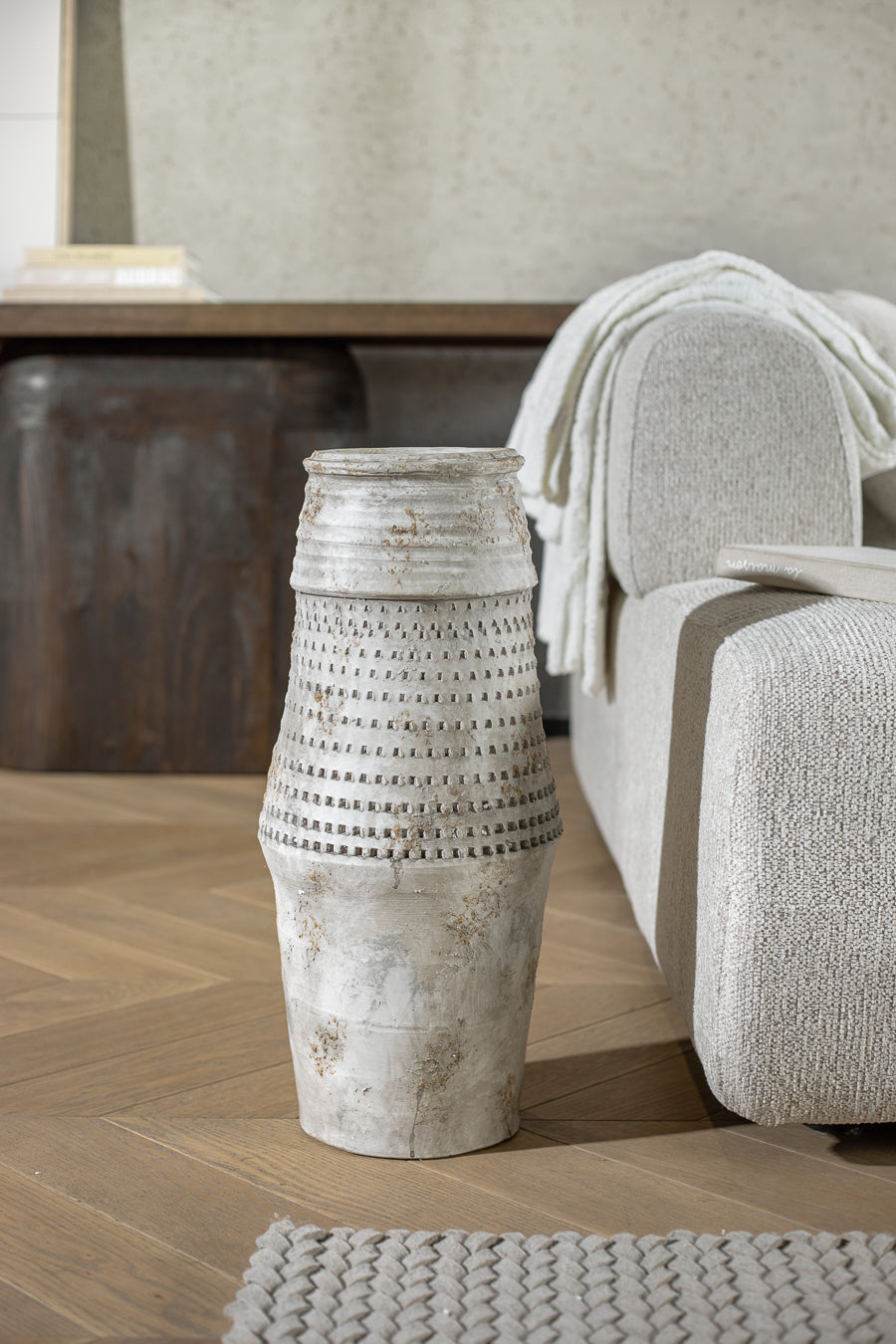 ואזה נבאדה נישאת בגוון אפור. אגרטל קרמיקה מעוצב חירור הקיפי מנימליסטי.