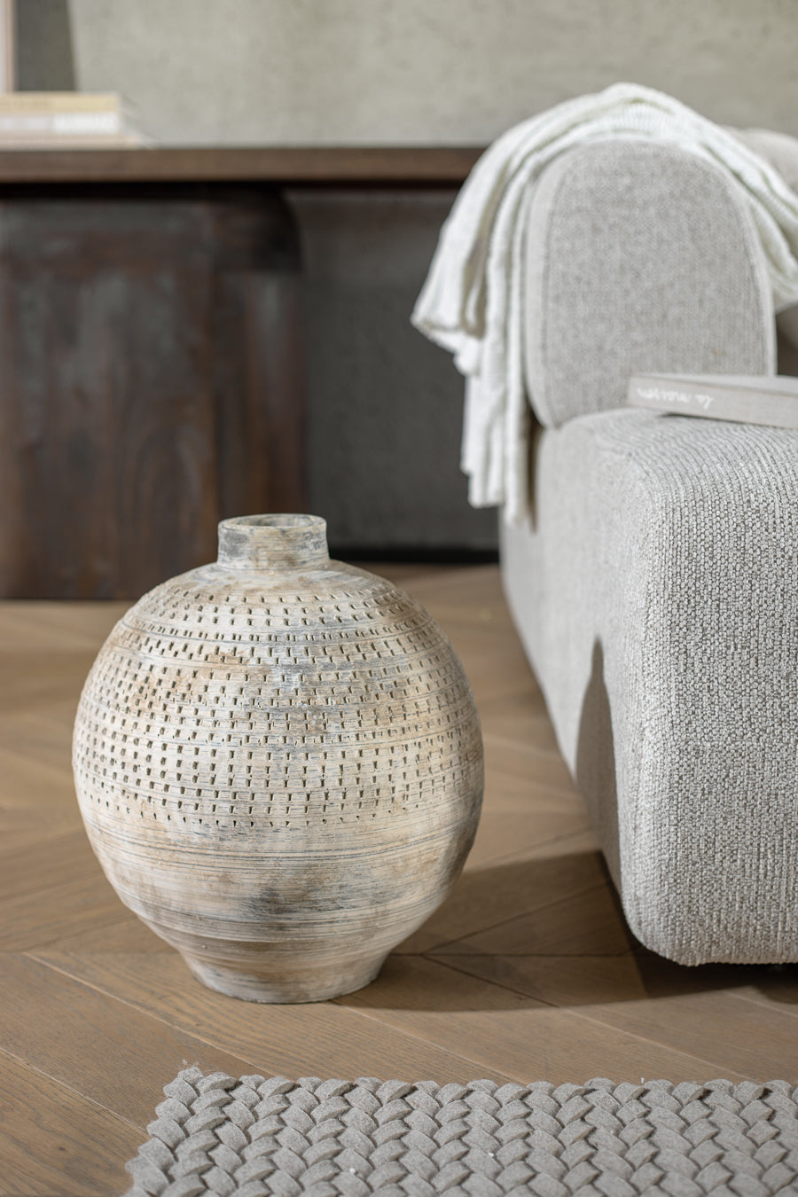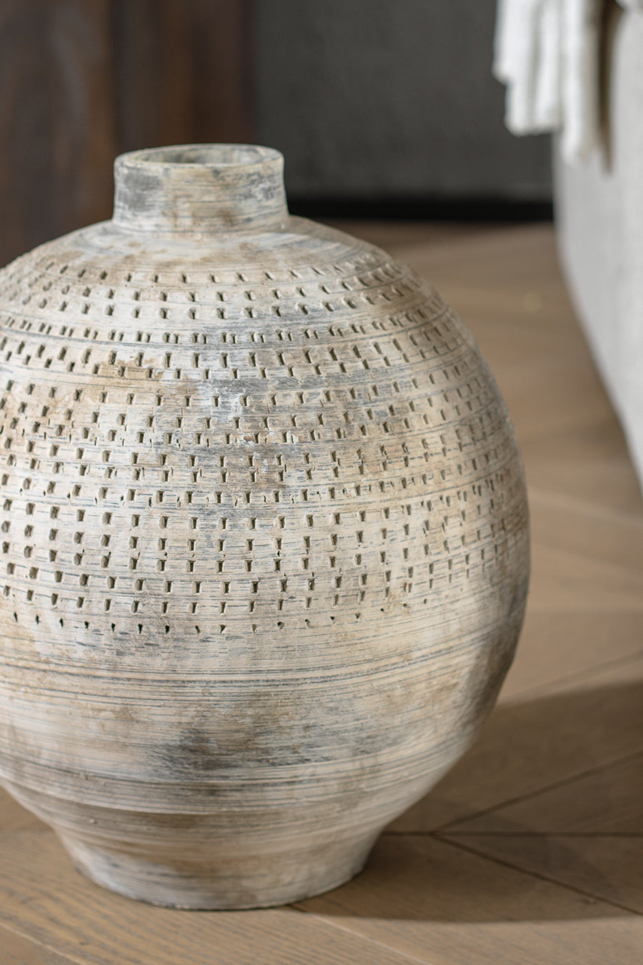 ואזה נבאדה עגולה בגוון חום טבעי. אגרטל קרמיקה אתני בגימור חירוץ חורים מינימליסטי.