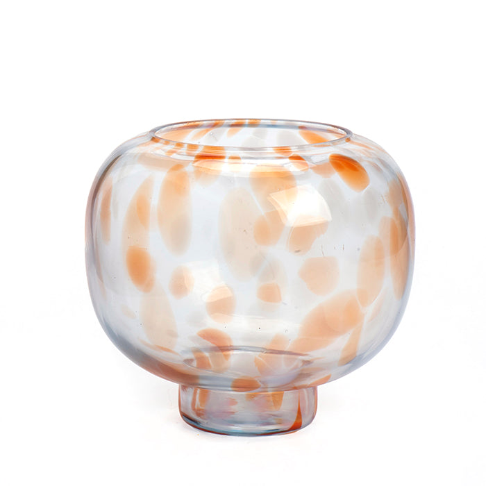 ואזה זכוכית לאופרד סילואט בדיגום חברבורות כתומות. ה-PIECE המדוייק שנוכחותו במרחב עושה את כל ההבדל! מומלץ למקמו על שולחן בקרבת מקור אור, להינות מאסתטיקת הכלי הנשקפת בחלל. ואזה זו היא פריט מסדרת אגרטלי בסיס לאופרד שנכון לשלב ביניהם.