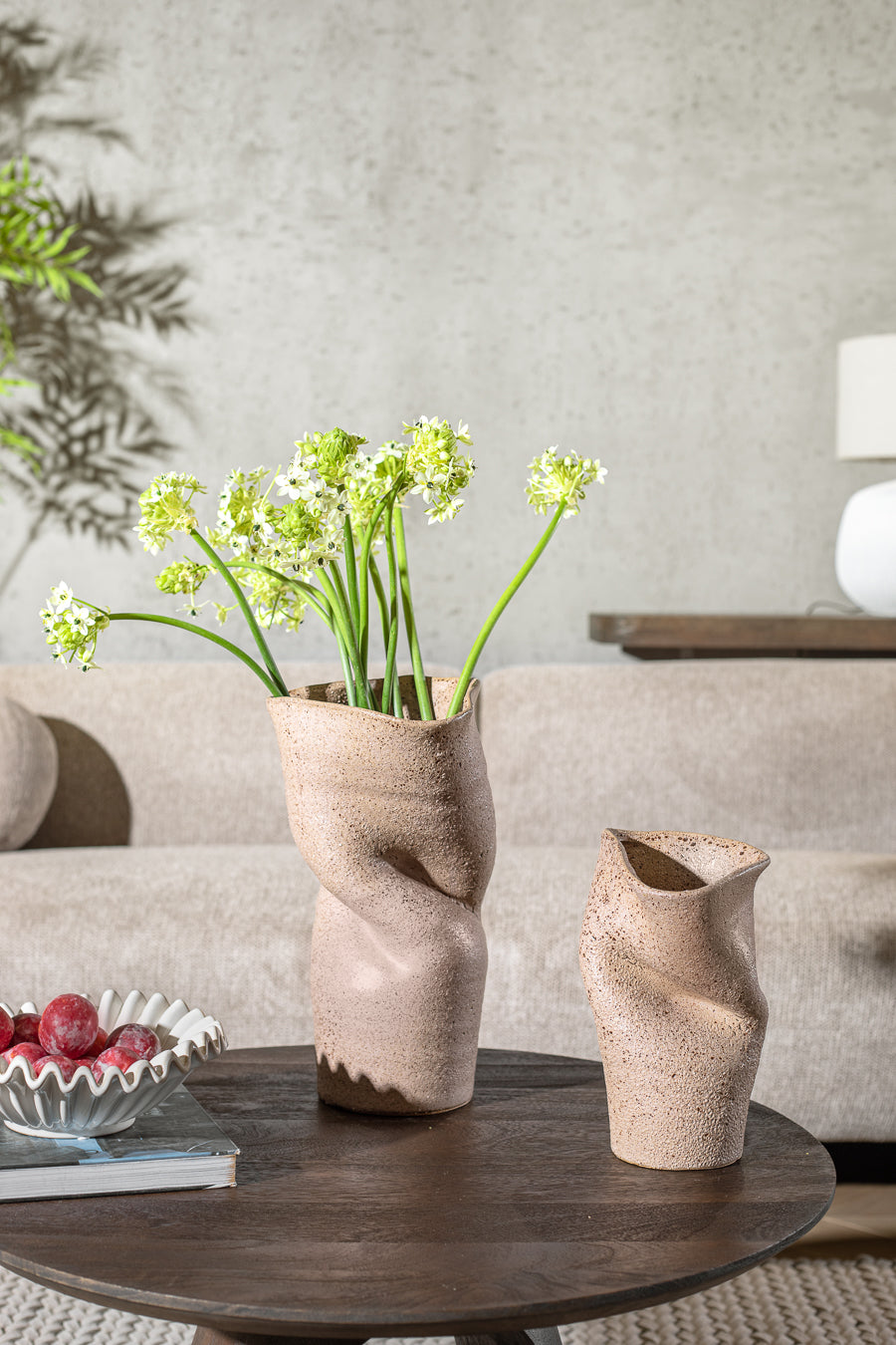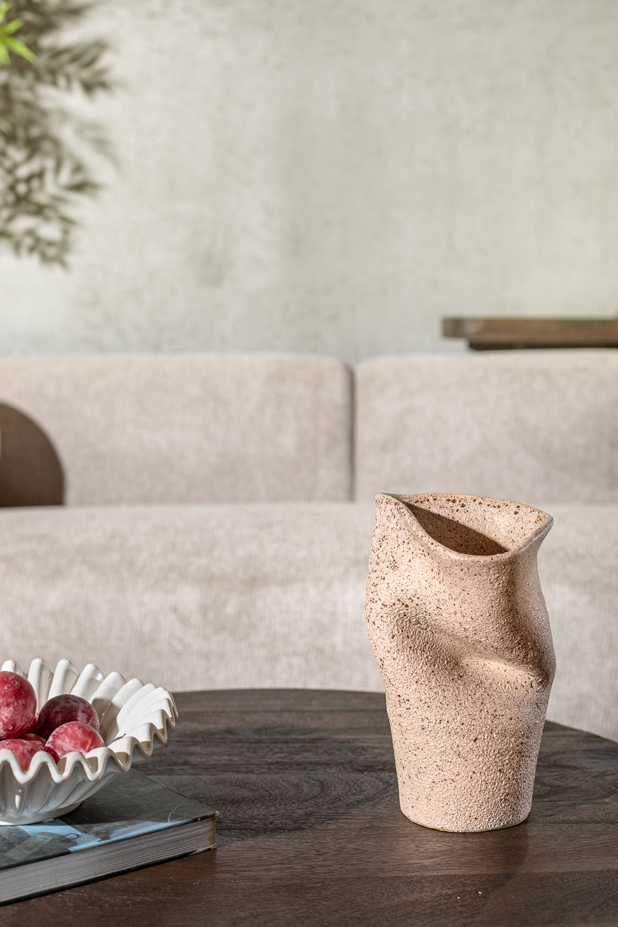 ואזה קראנץ' בגוון חום. אגרטל קרמיקה מעוצב גוף ארוך מעוקם, המדמה תנועה במרחב.