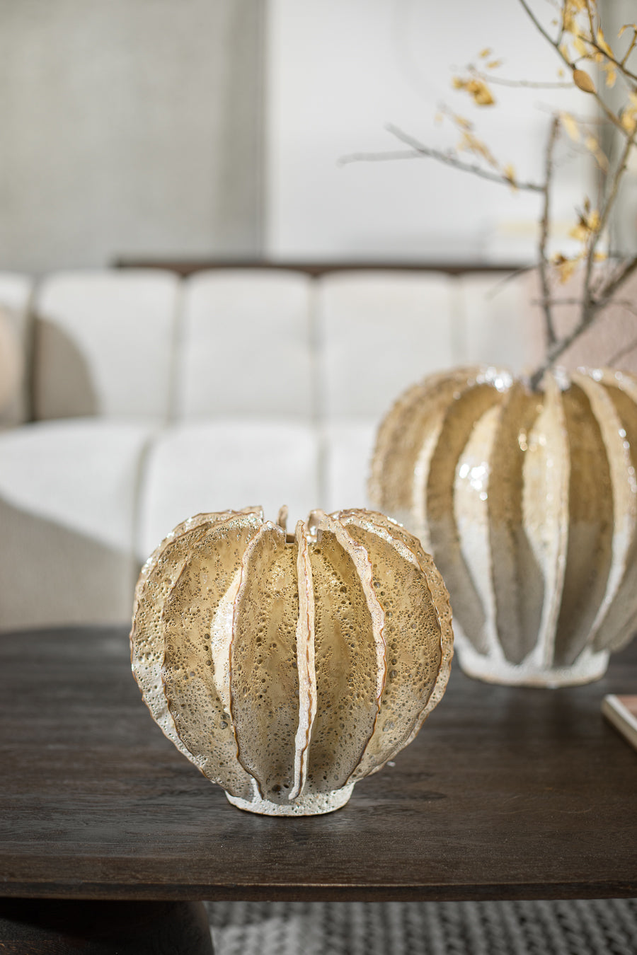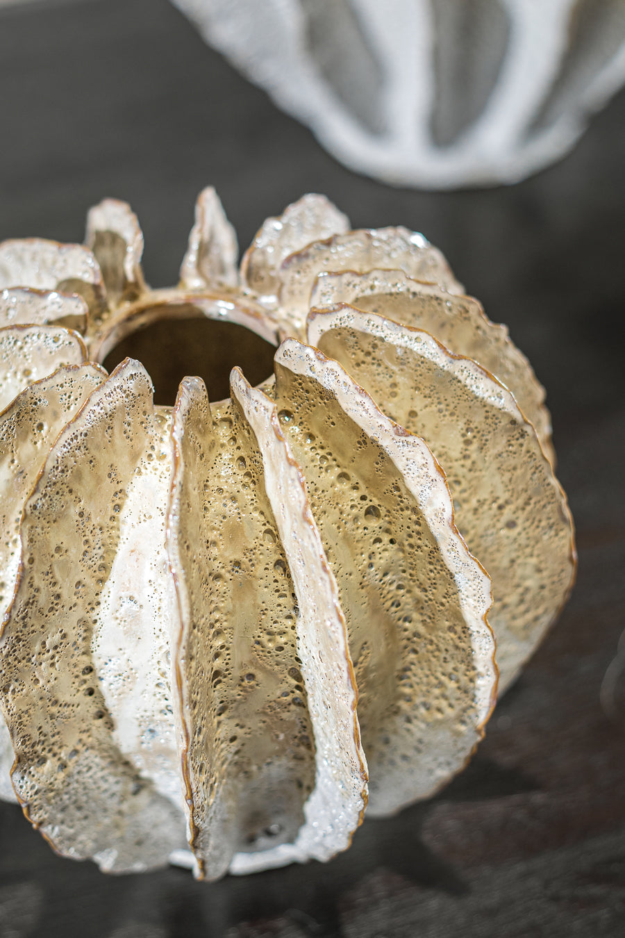 ואזה ריף משוננת בגוון בהיר. אגרטל קרמיקה ייחודי, מעוצב אלמוג בצבעוניות רגועה.