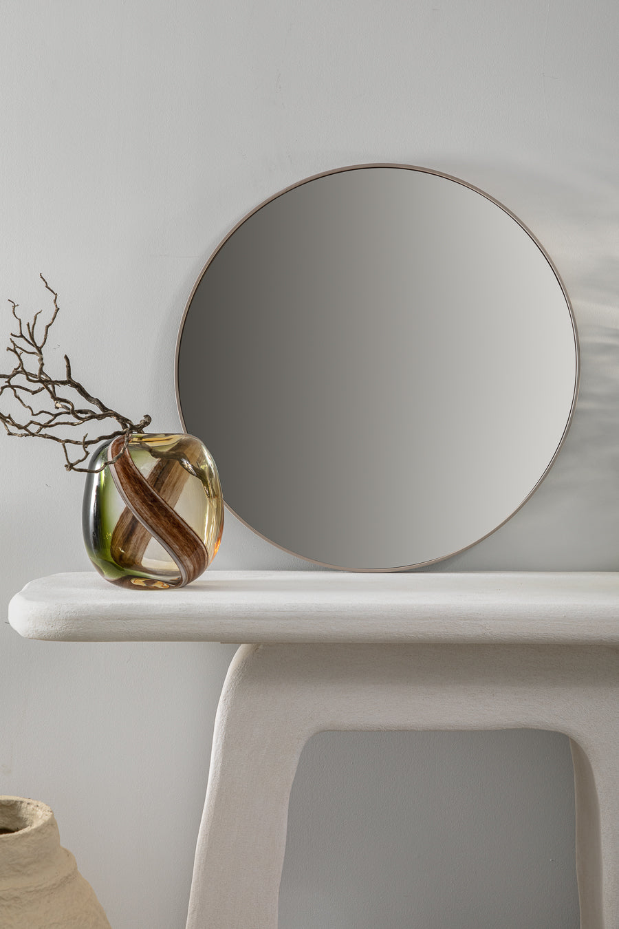 מראה עגולה טיימלס ראונד ממוסגרת קו מתאר מוזהב. מראה קלאסית בנגיעה קורצת לשיבוץ בחדר השינה או בכניסה לחלל הבית.