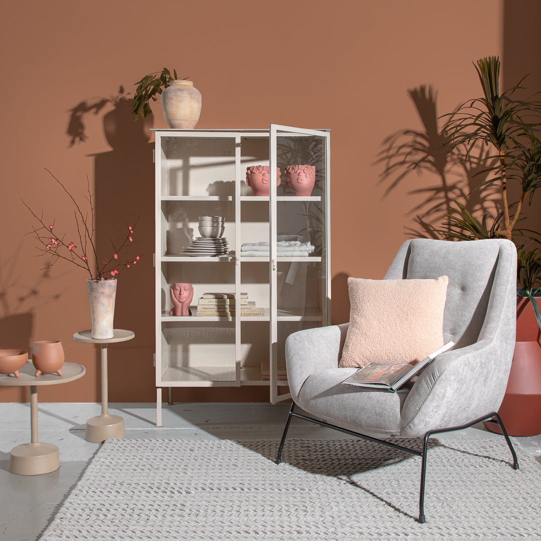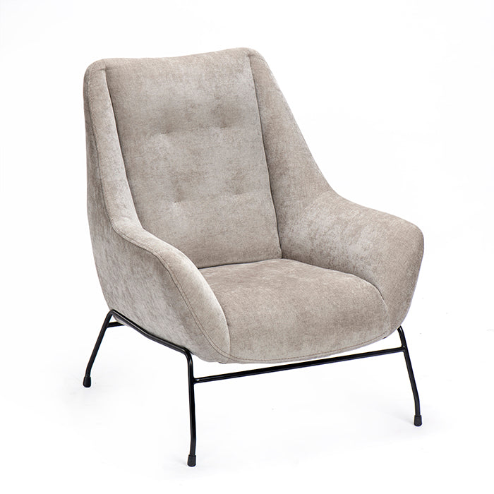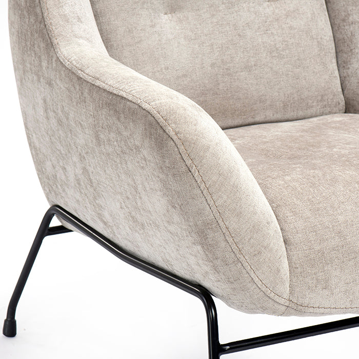 כורסה ספייס נוכחת בצבע בז'. כורסה מעוצבת בד במרקם קטיפתי ונישאת על רגלי מתכת שחורות.