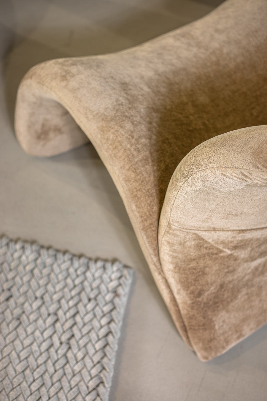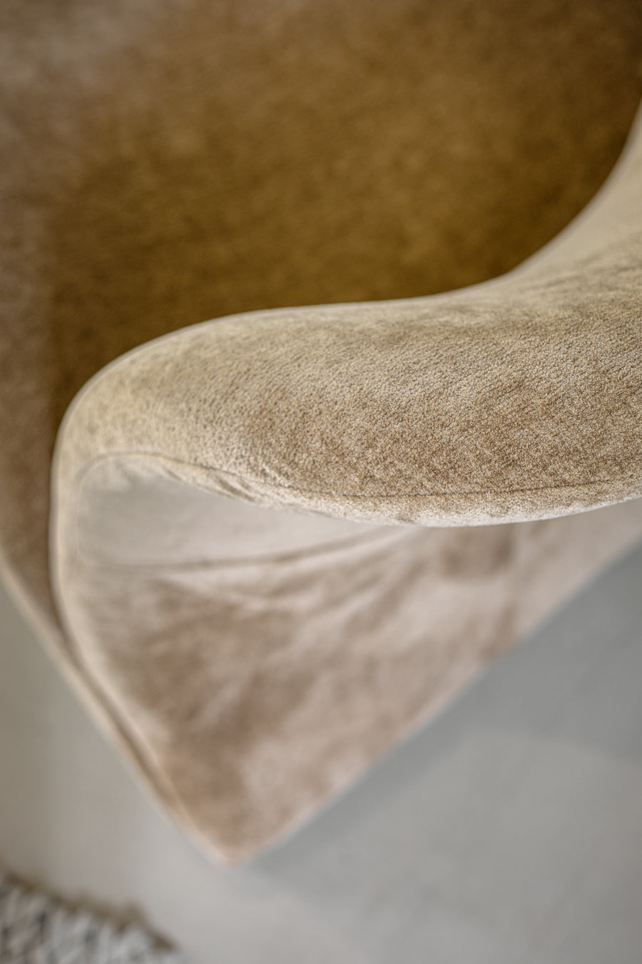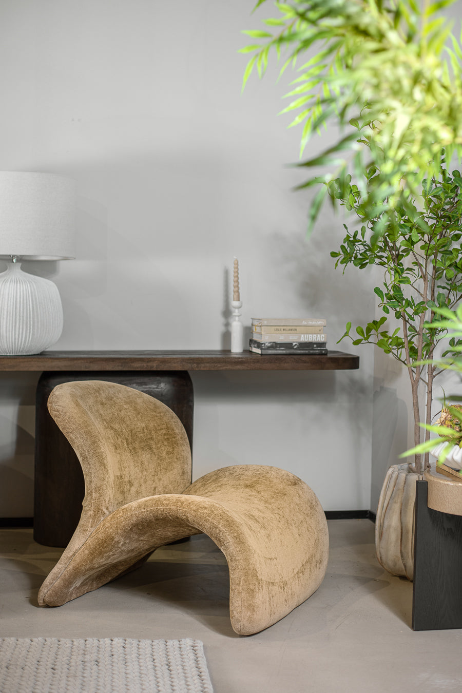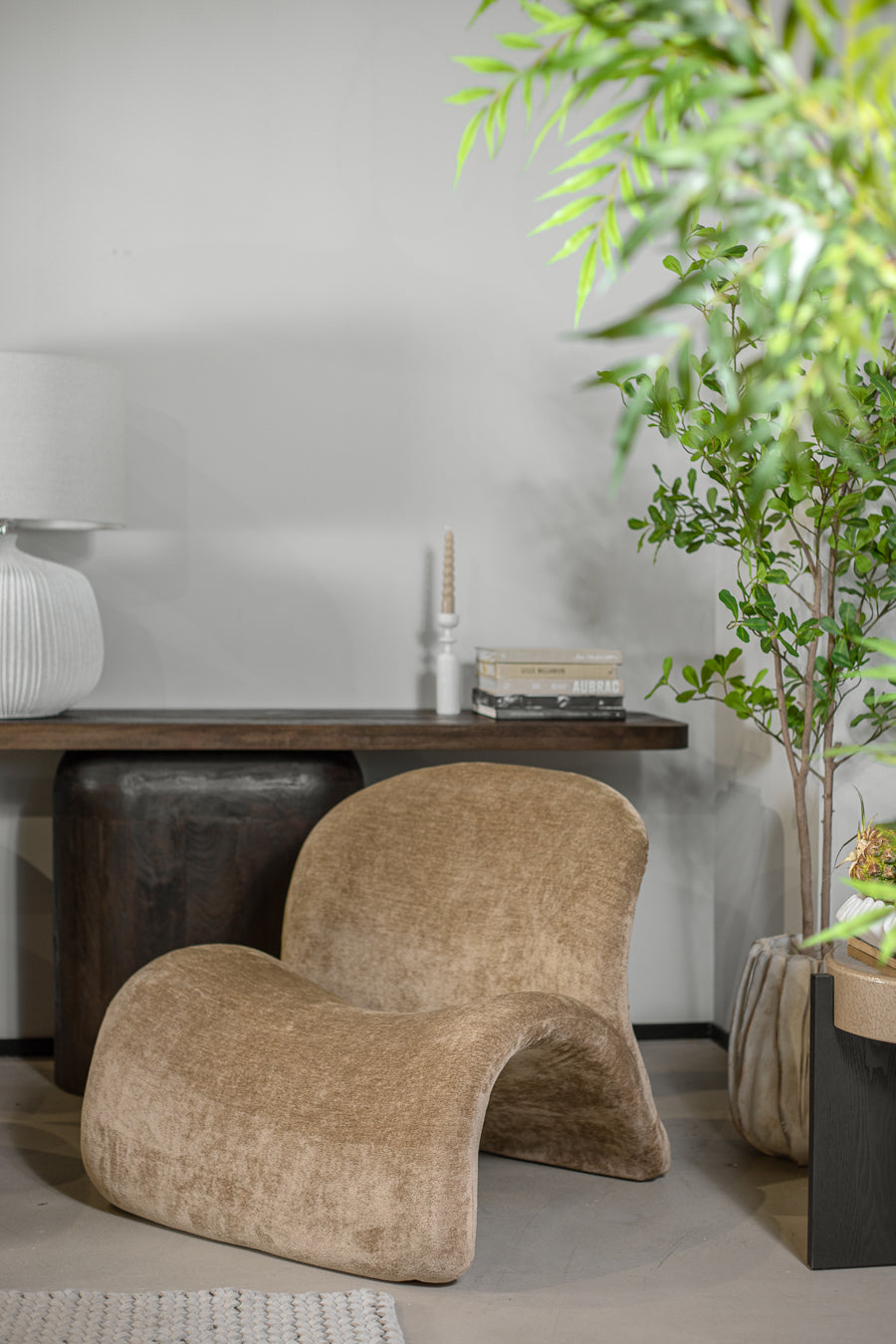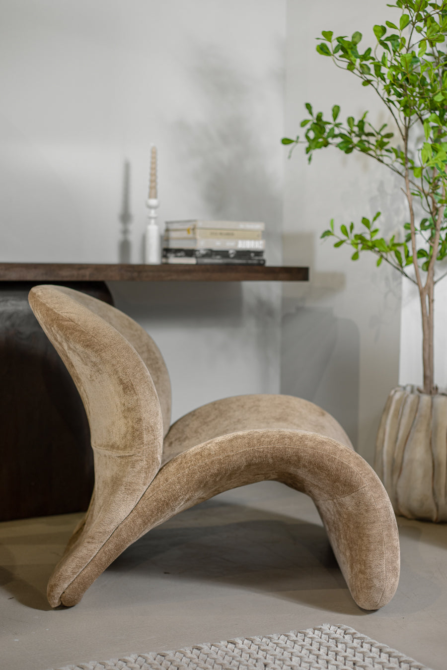 כורסאת אירוח אורסולה מקשה אחת בגוון חום. כורסה מעוצבת פרופיל מתעקל במרקם חלק.