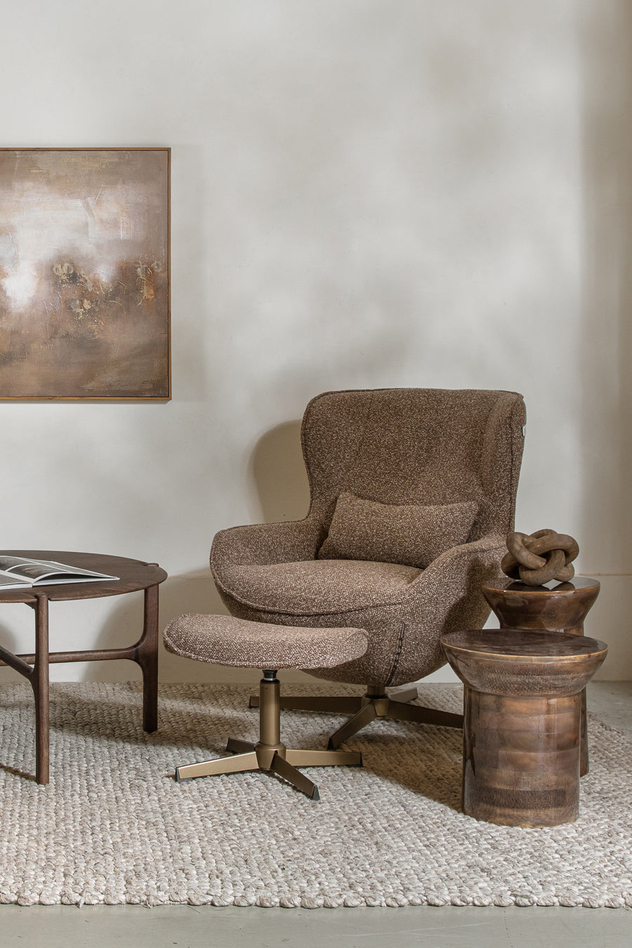 כורסה והדום ארצ'י בגוון חום. סט כורסה מעוצבת משענת גב גבוהה והדום תואם בעיצוב אלגנטי מודרני.