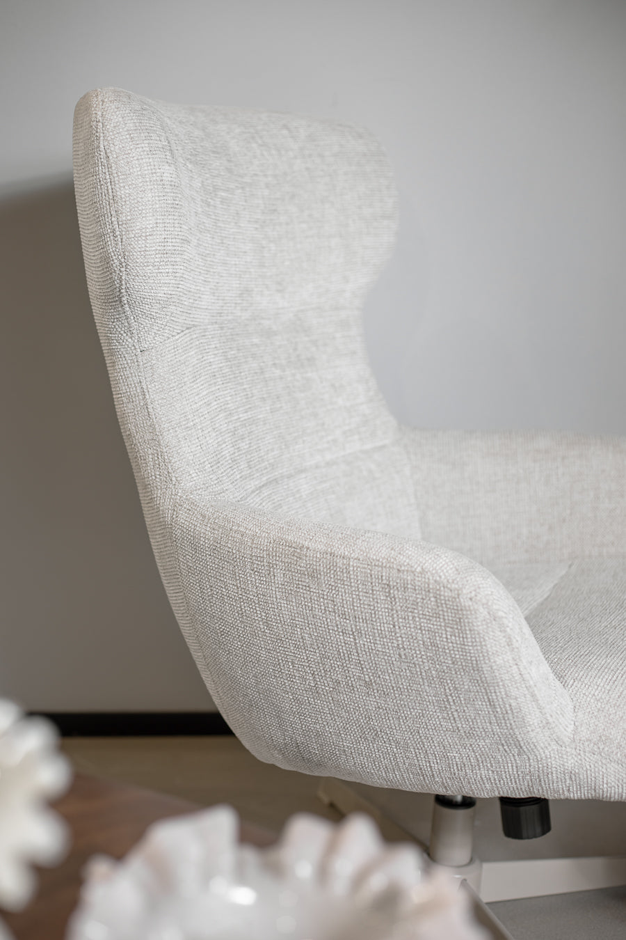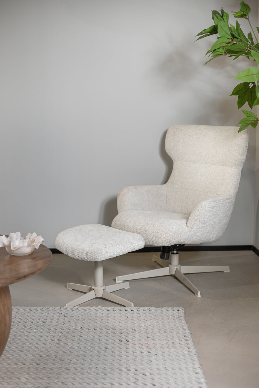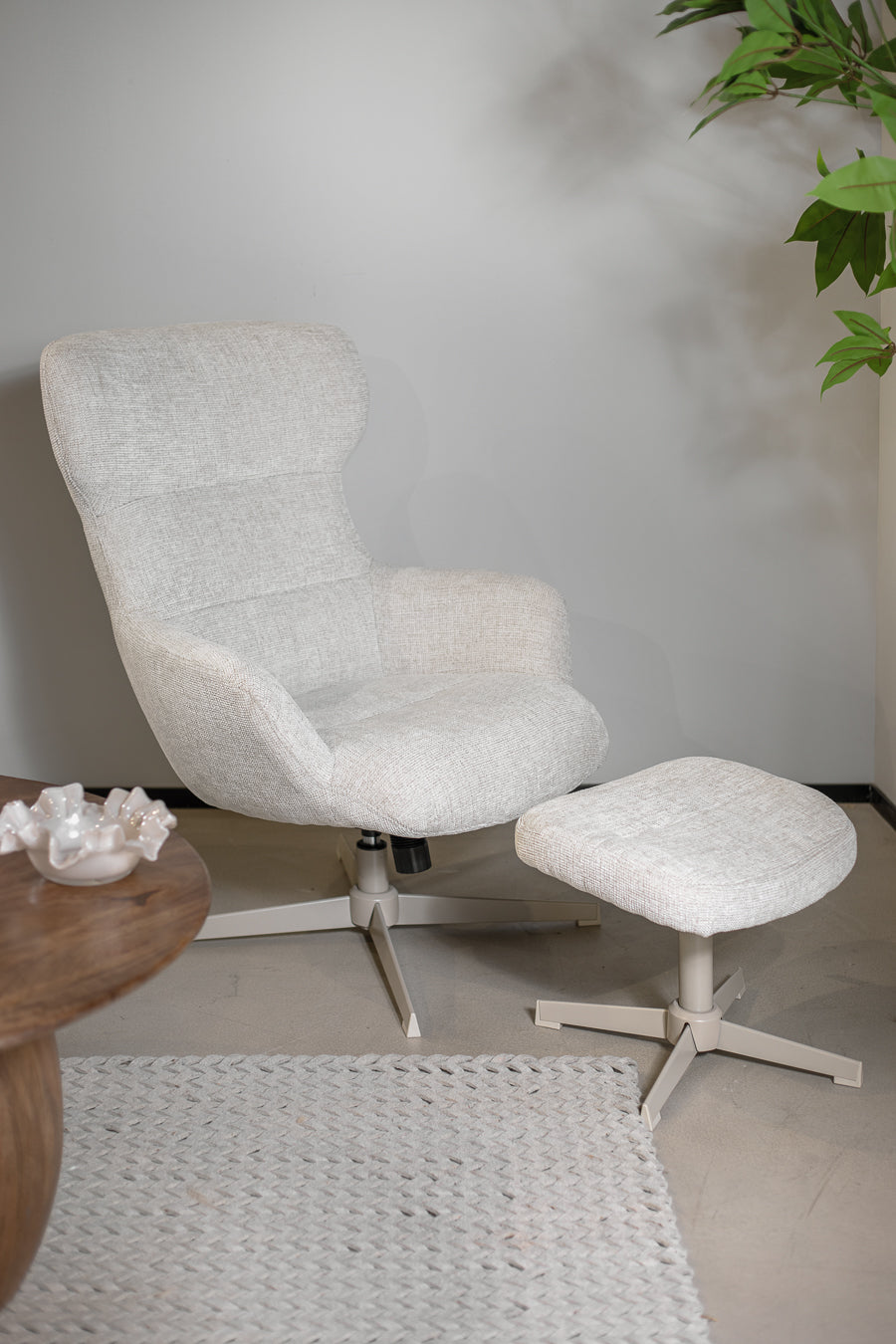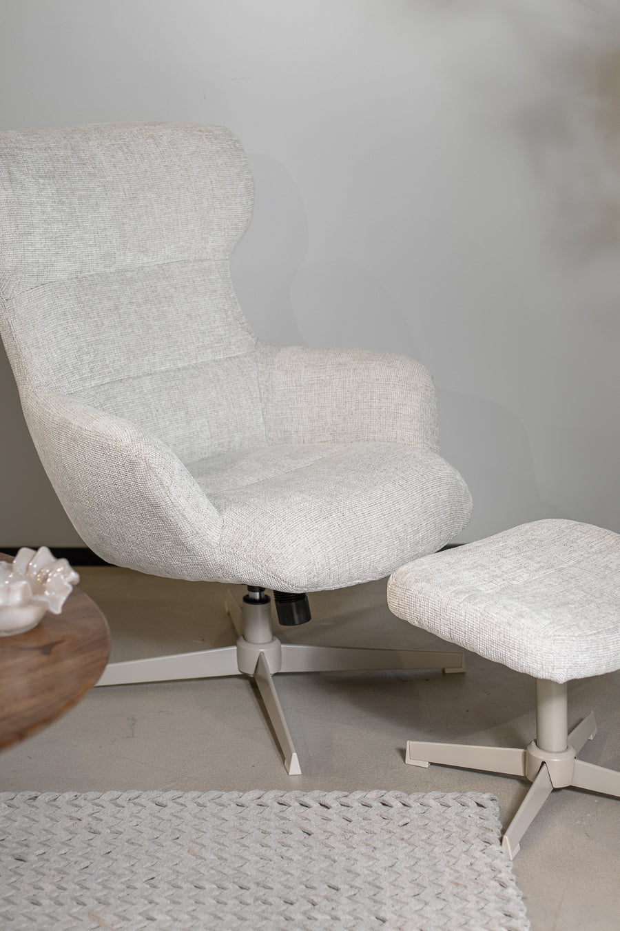 כורסה והדום ארצ'י בצבע לבן. סט כורסה מסתובבת, מעוצבת משענת גב גבוהה והדום תואם, בעיצוב אלגנטי מודרני .