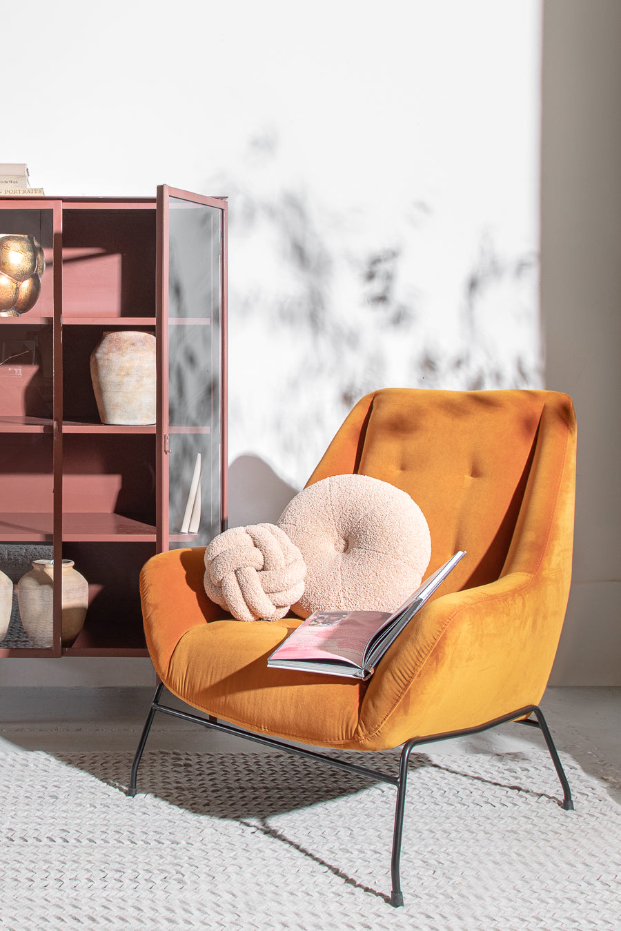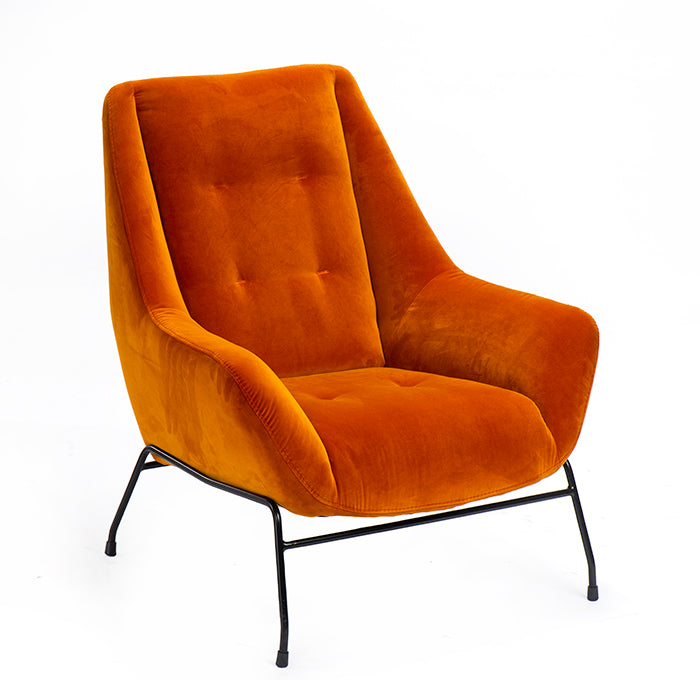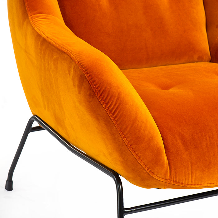 כורסה ספייס נוכחת בגוון כתום. כורסה מעוצבת בד במרקם קטיפתי ונישאת על רגלי מתכת שחורות.