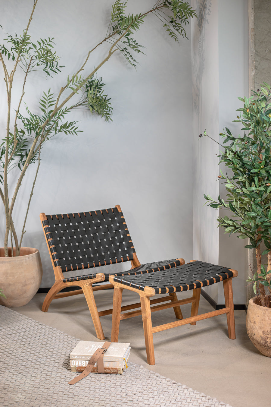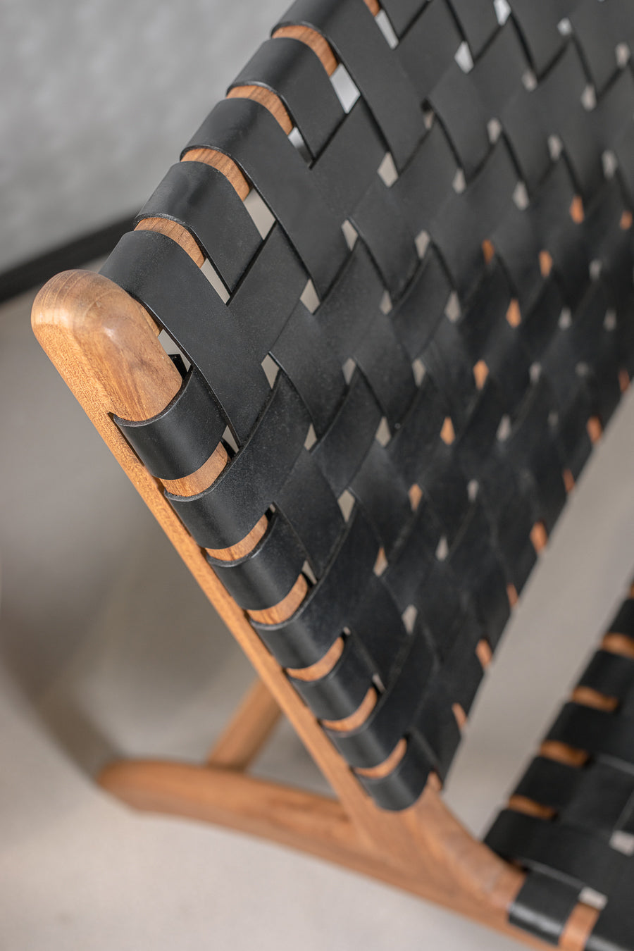 כורסת עור לאונג' קלוע בצבע שחור. כיסא טרקלין מעוצב קליעת עור בדיגום שתי וערב, הנישא על רגליי עץ טיק.