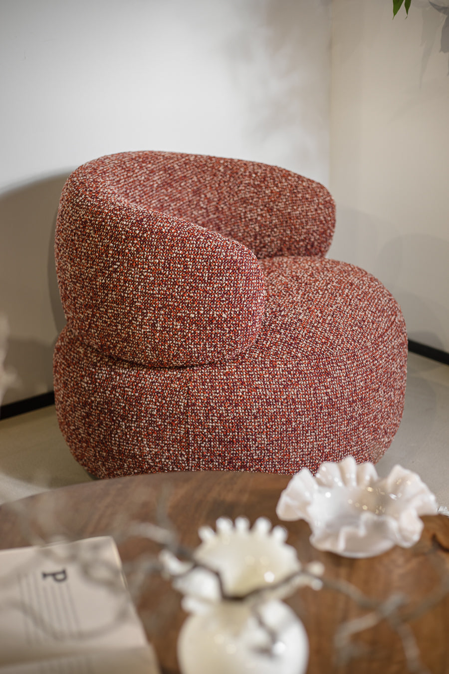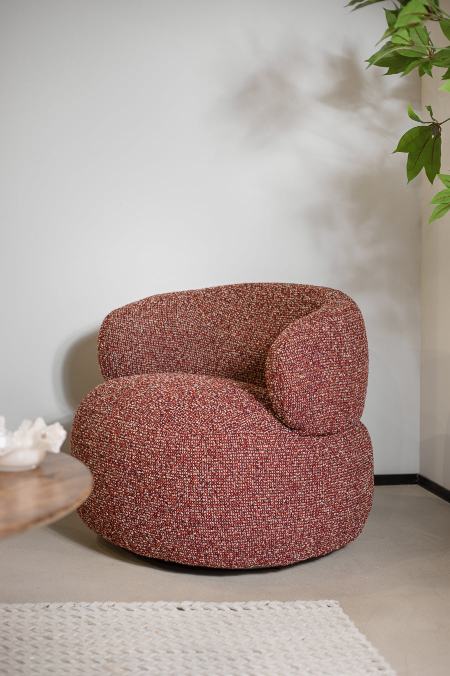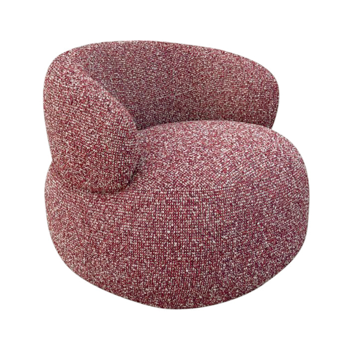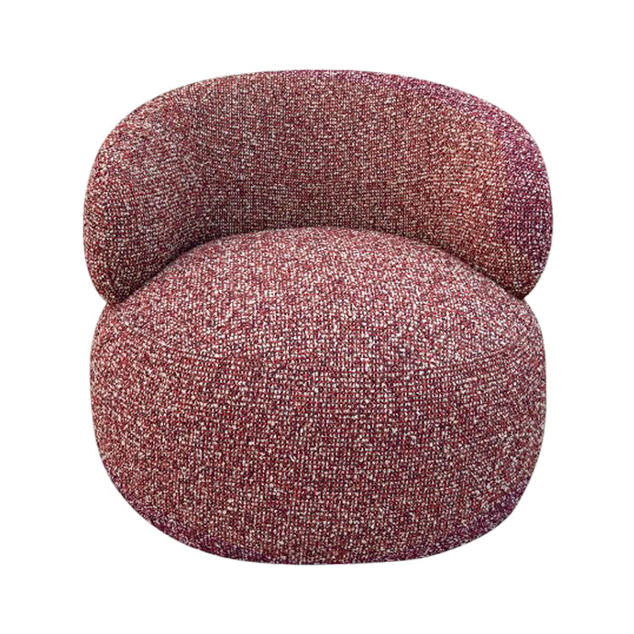 כורסה מסתובבת קרוסבי בגוון אדום. כורסת ישיבה עוטפת, מרופדת בד אריג אל זמני ותושבת עגולה. כורסת יחיד נוכחת בעיצוב אורבני שובה.