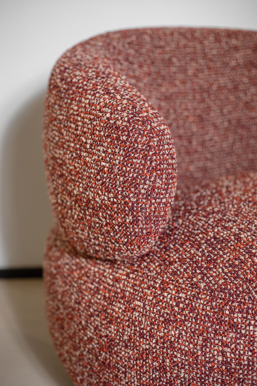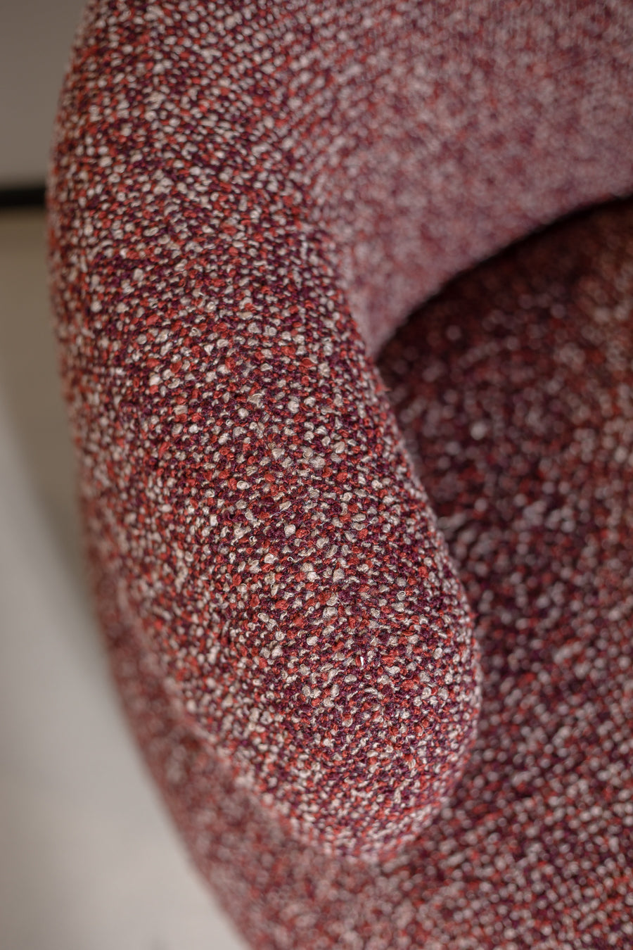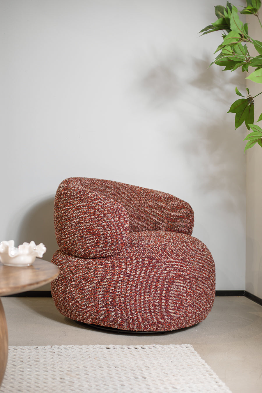 כורסה מסתובבת קרוסבי בגוון אדום. כורסת ישיבה עוטפת, מרופדת בד אריג אל זמני ותושבת עגולה. כורסת יחיד נוכחת בעיצוב אורבני שובה.