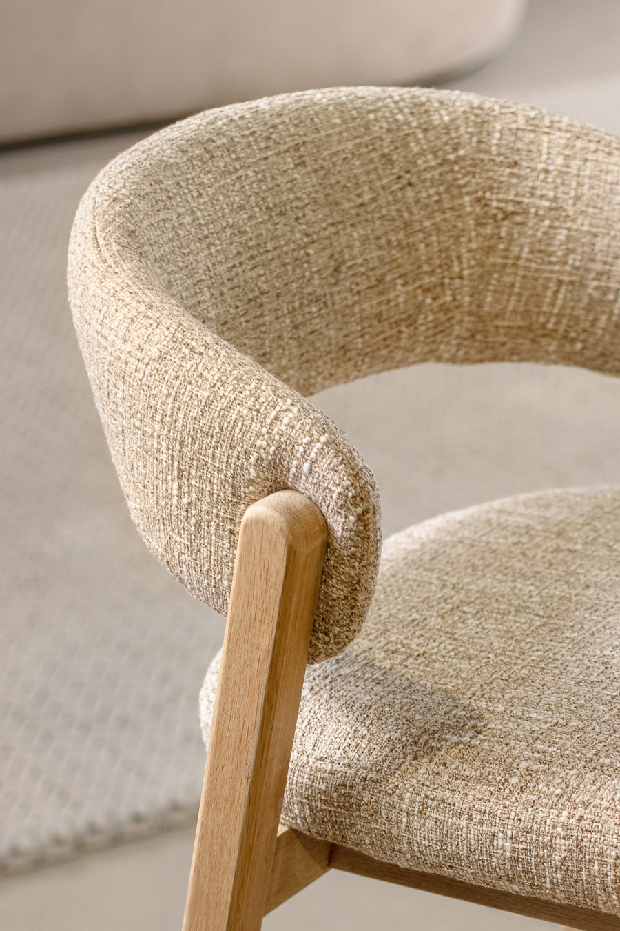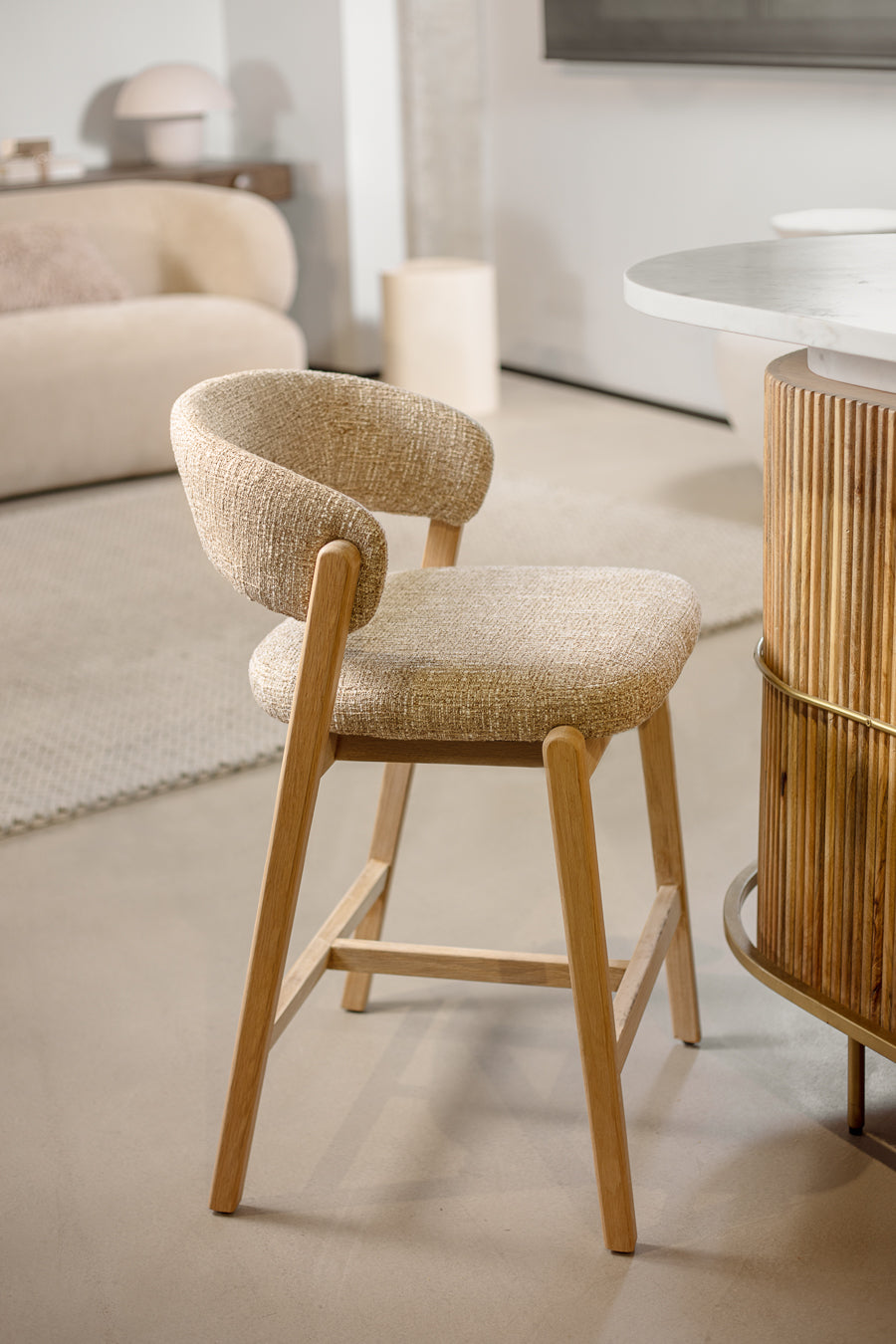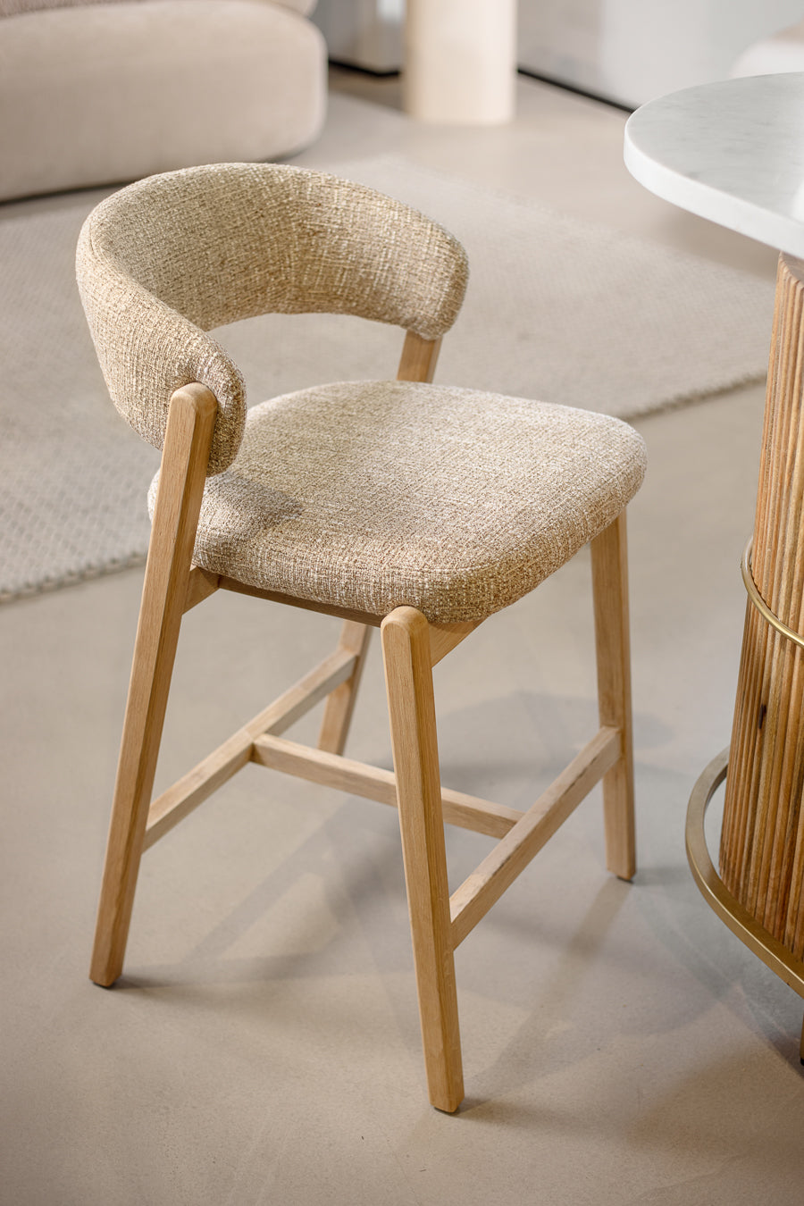 כיסא בר אלסנדרו בגוון בהיר. כיסא ישיבה גבוה, מעוצב משענת ומושב מרופדים בקו רטרו עכשווי.