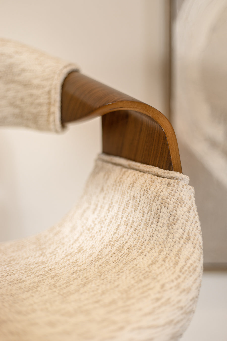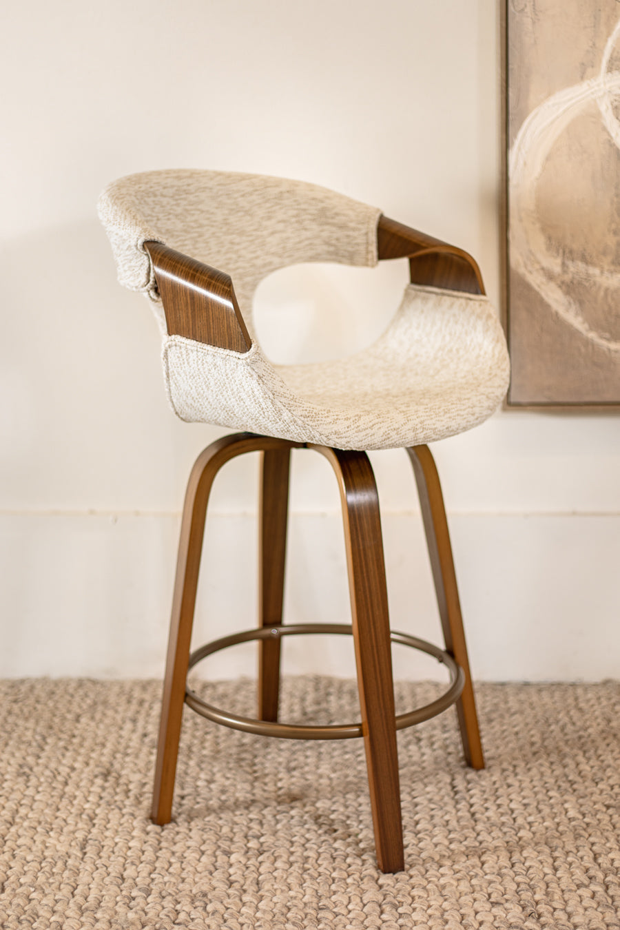 כיסא בר ניקולסון בגוון בהיר. כיסא בר מסתובב, מעוצב עץ ו-בד בחיבור הרמוני עוטף.