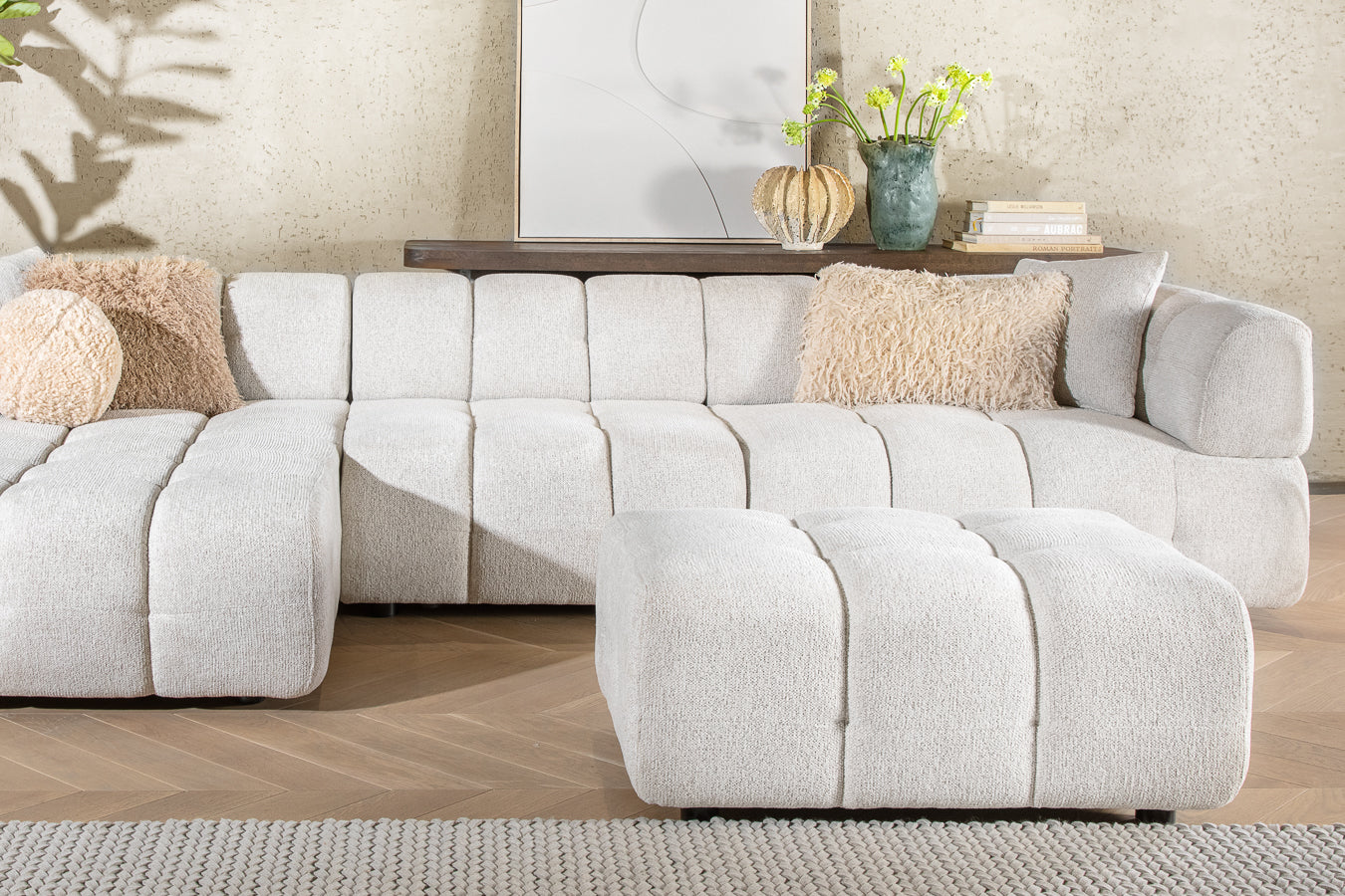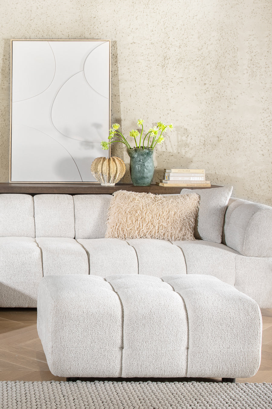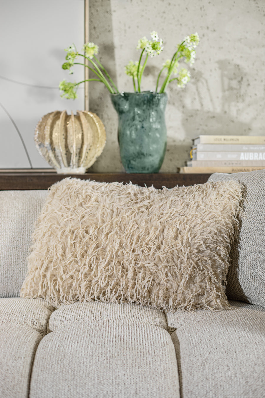 כרית נוי פאפי בצבע בז'. כרית מלבנית בוהו שיק, מעוצבת פלומות שיער ארוךבמראה פרוותי מפנק.