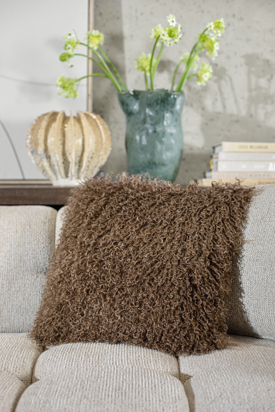 כרית נוי פאפי בצבע חום. כרית ריבועית בוהו שיק, מעוצבת פלומות שיער ארוךבמראה פרוותי מפנק.