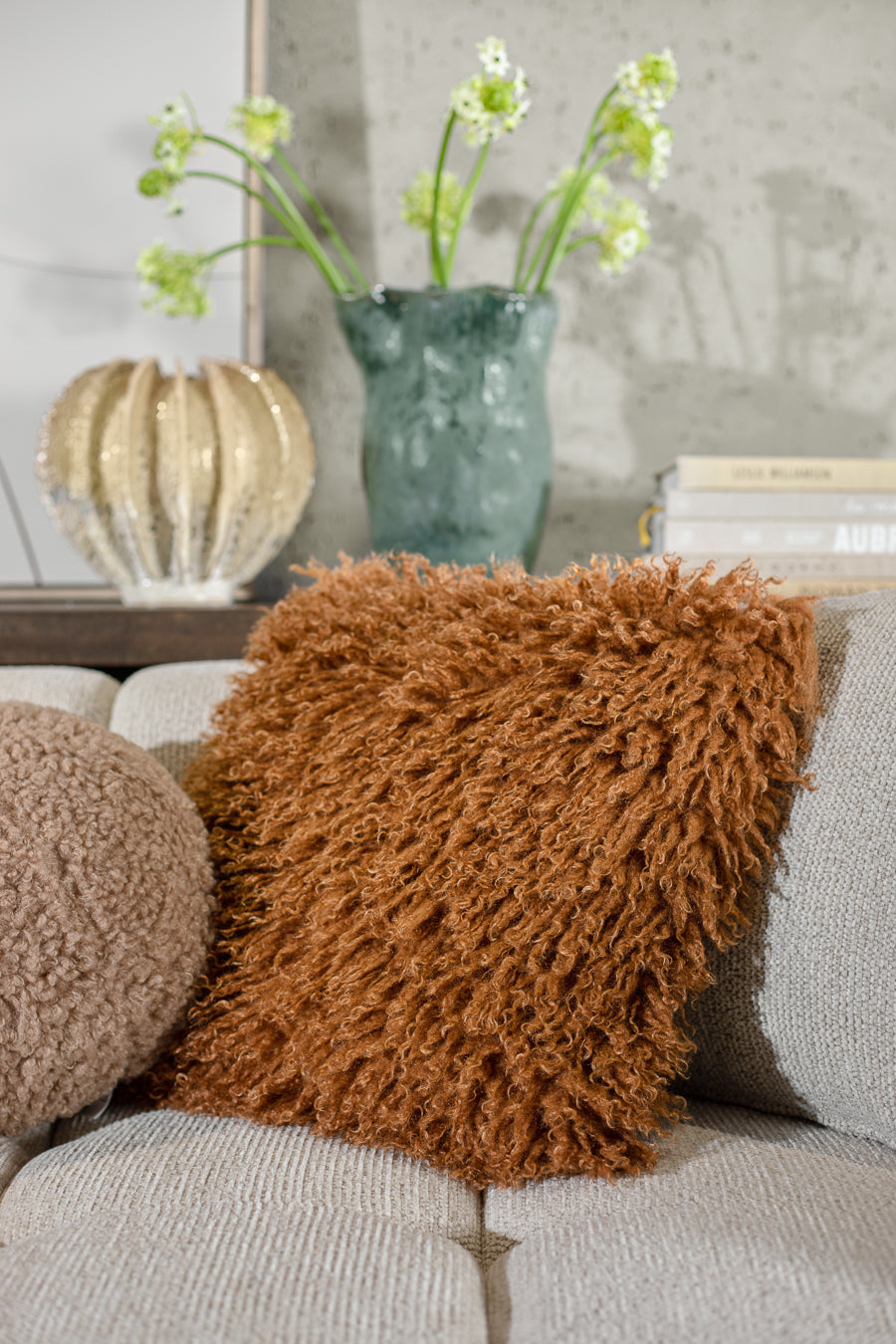כרית נוי פאפי בגוון חום ג'ינג'י. כרית ריבועית בוהו שיק, מעוצבת פלומות שיער ארוךבמראה פרוותי מפנק.