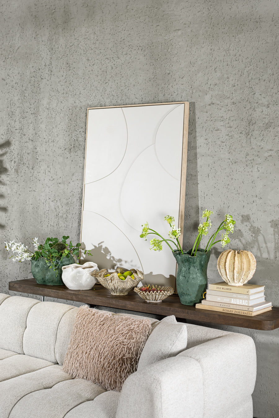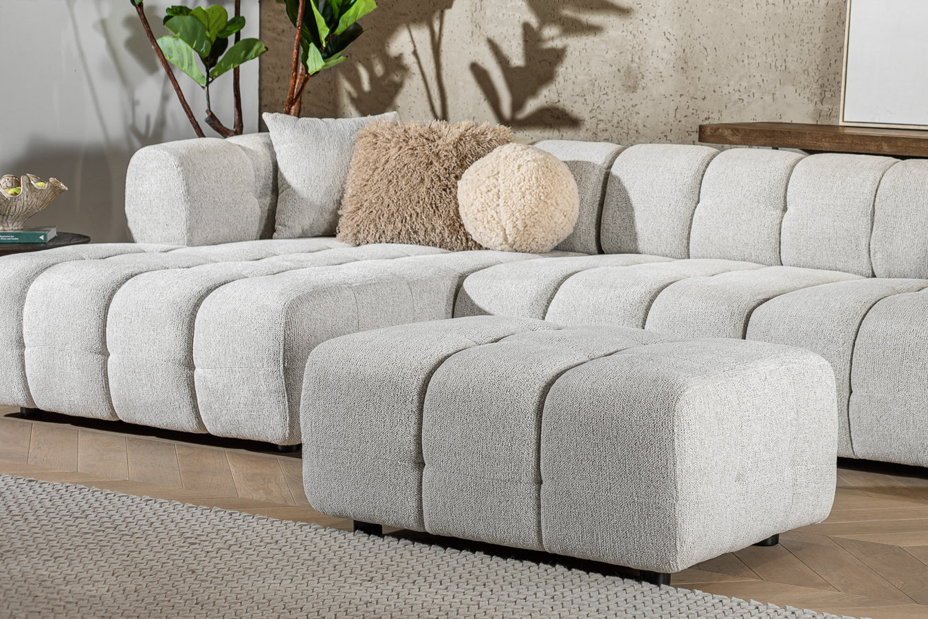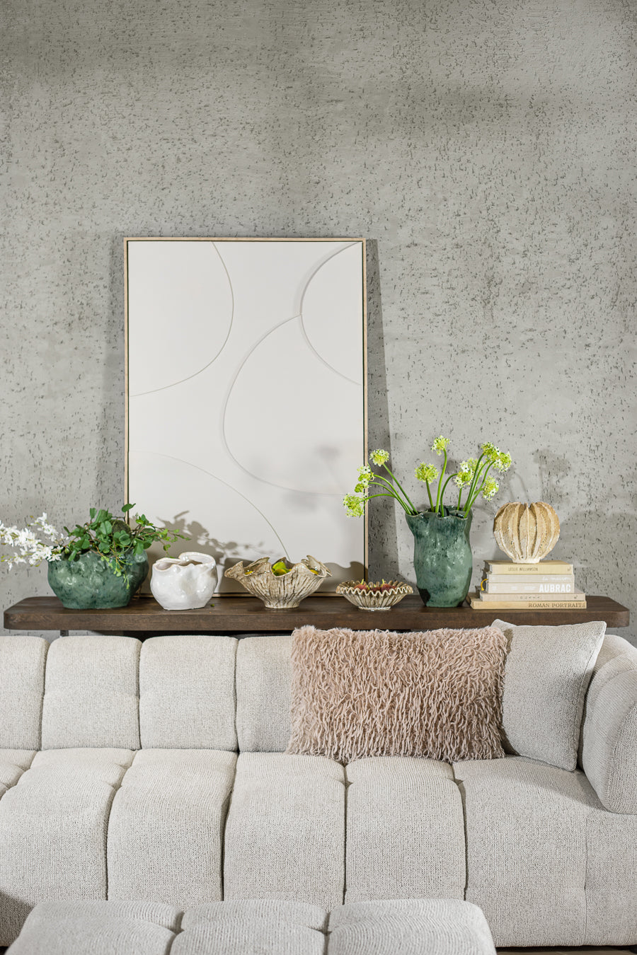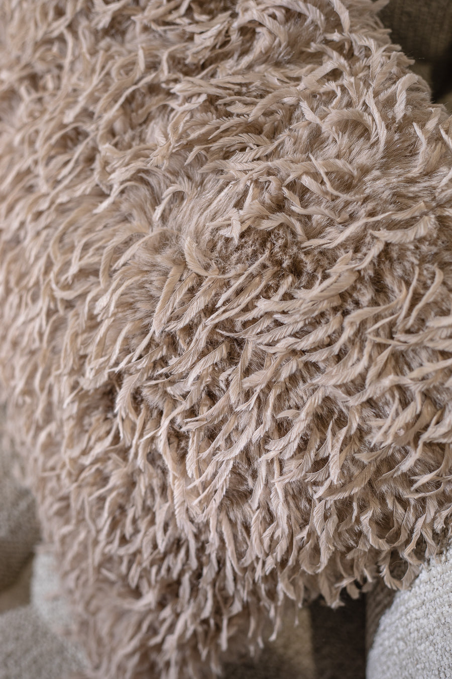כרית נוי פאפי בגוון בהיר. כרית מלבנית בוהו שיק, מעוצבת פלומות שיער ארוךבמראה פרוותי מפנק.