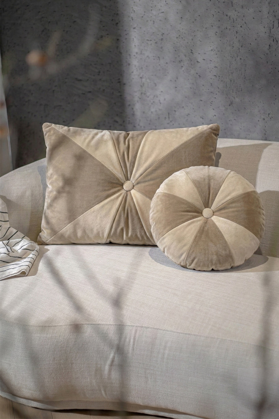 כרית נוי בוגי בגוון בהיר. כרית עגולה, מעוצבת אלמנט גרפי בשני צבעים.