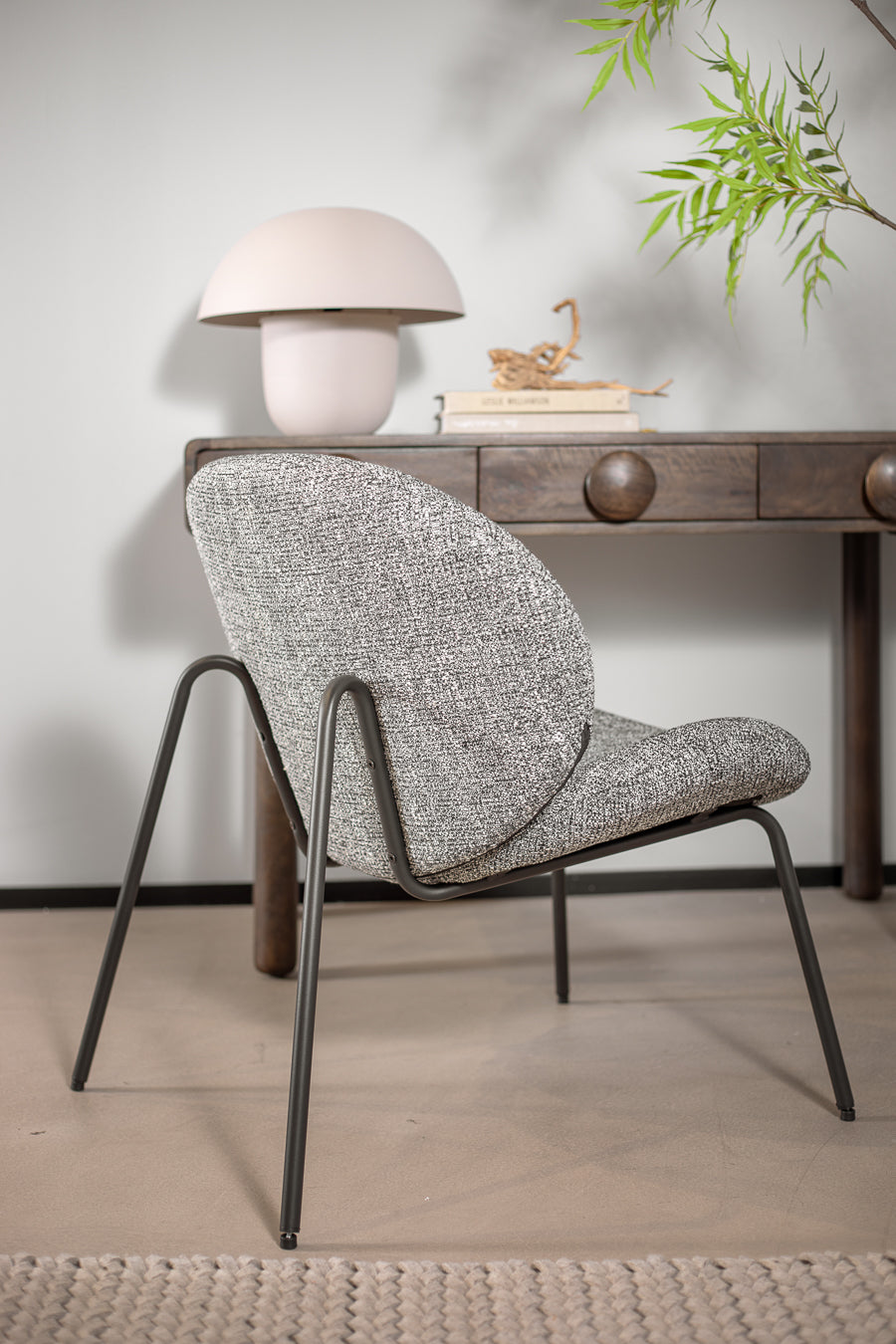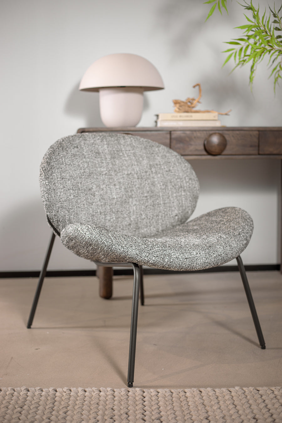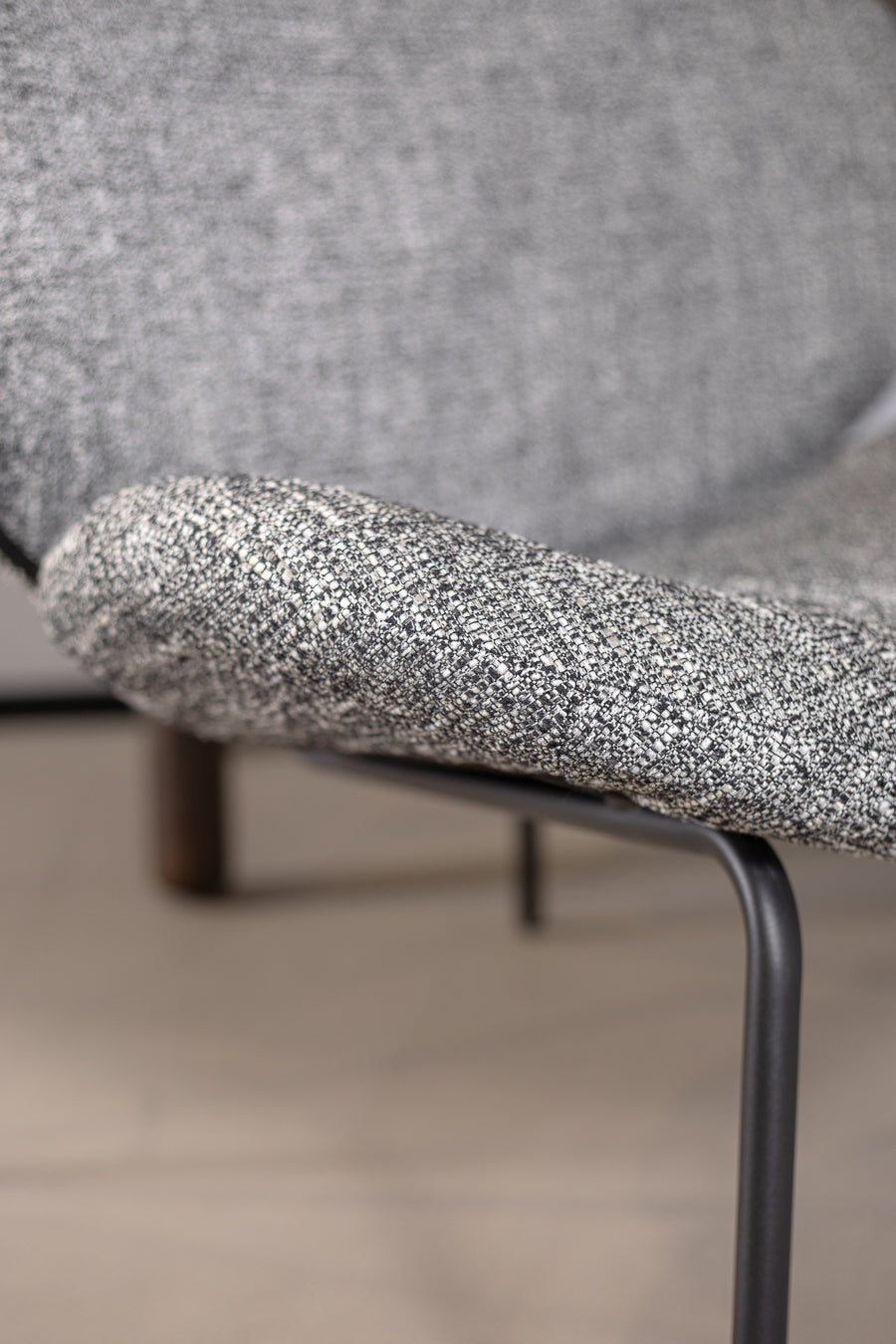 לאונג' צ'ייר לייזי מדיסון בגוון אפור. כורסה מעוצבת משענת ותושבת מעוגלים, הנישאת על רגלי מתכת בגוון זהה.