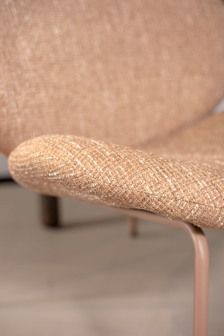 לאונג' צ'ייר לייזי מדיסון בגוון חם. כורסה מעוצבת משענת ותושבת מעוגלים, הנישאת על רגלי מתכת בגוון זהה.