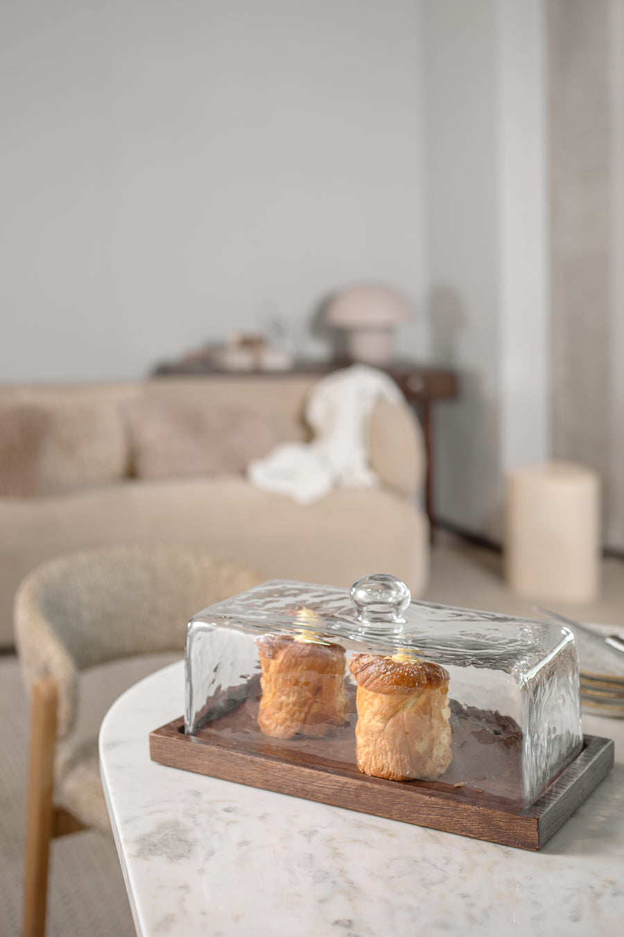 מגש ו-דום אורגניק בגוון עץ כהה. כלי הגשה מלבני מעוצב מכסה זכוכית ומגש עץ מנגו נוכח.
