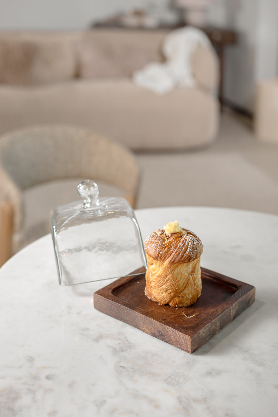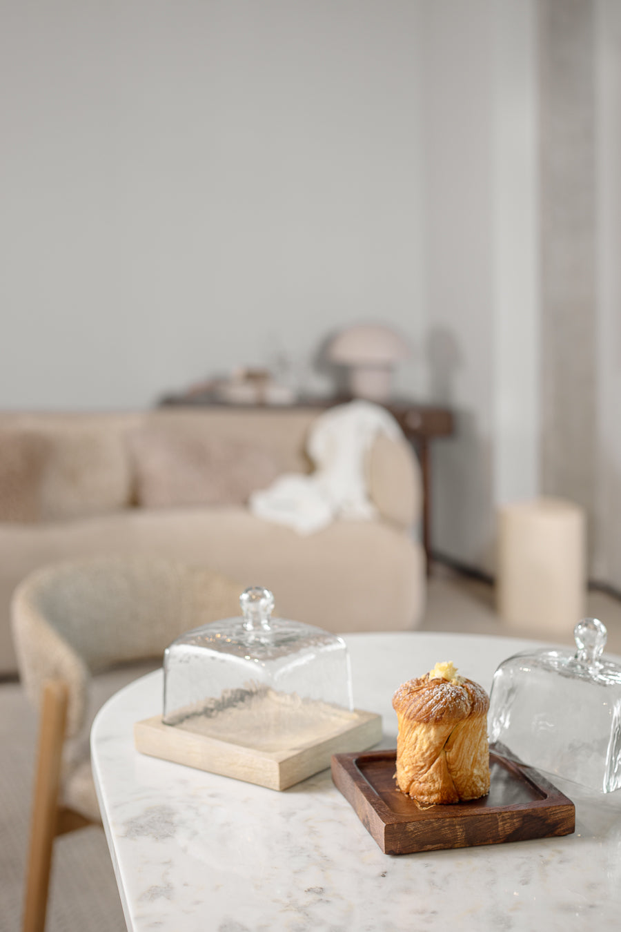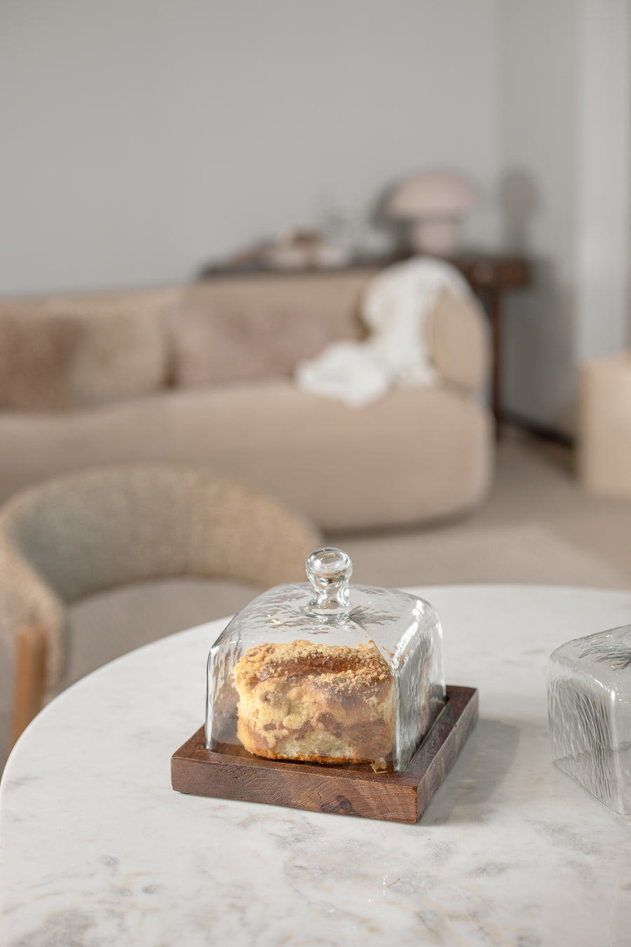 מגש ו-דום אורגניק בגוון עץ כהה. כלי הגשה ריבועי מעוצב מכסה זכוכית ומגש עץ מנגו נוכח.