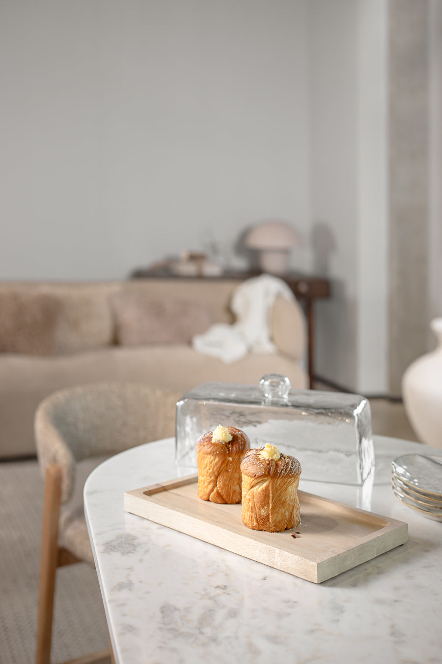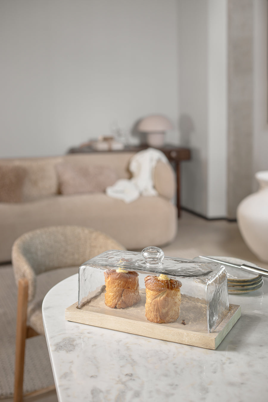 מגש אינגליש קייק אורגניק מלבני בגוון עץ טבעי. כלי הגשה קלאסי מעוצב שוליים מוגבהים, מגיע עם פעמון זכוכית תואם וידית אחיזה .