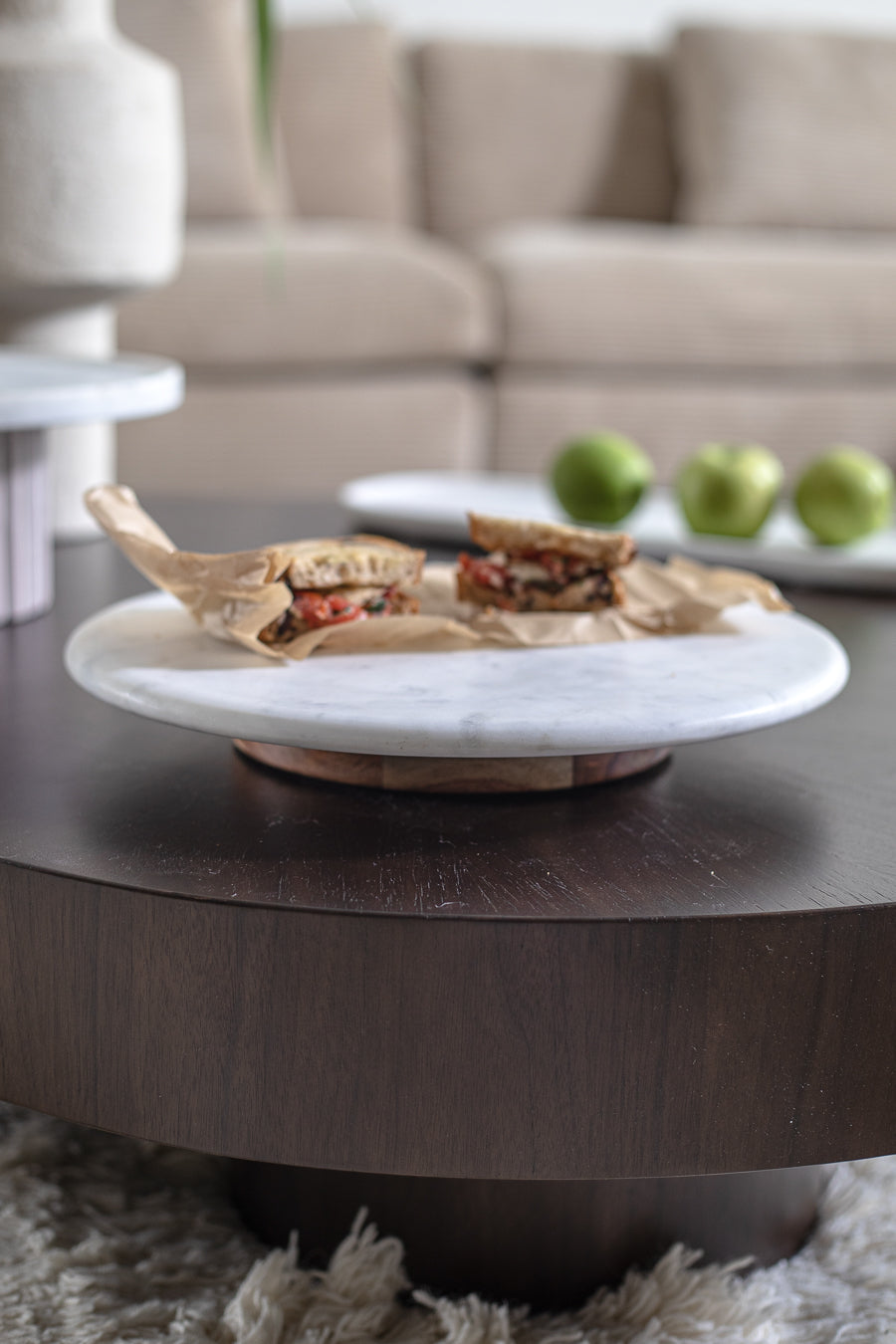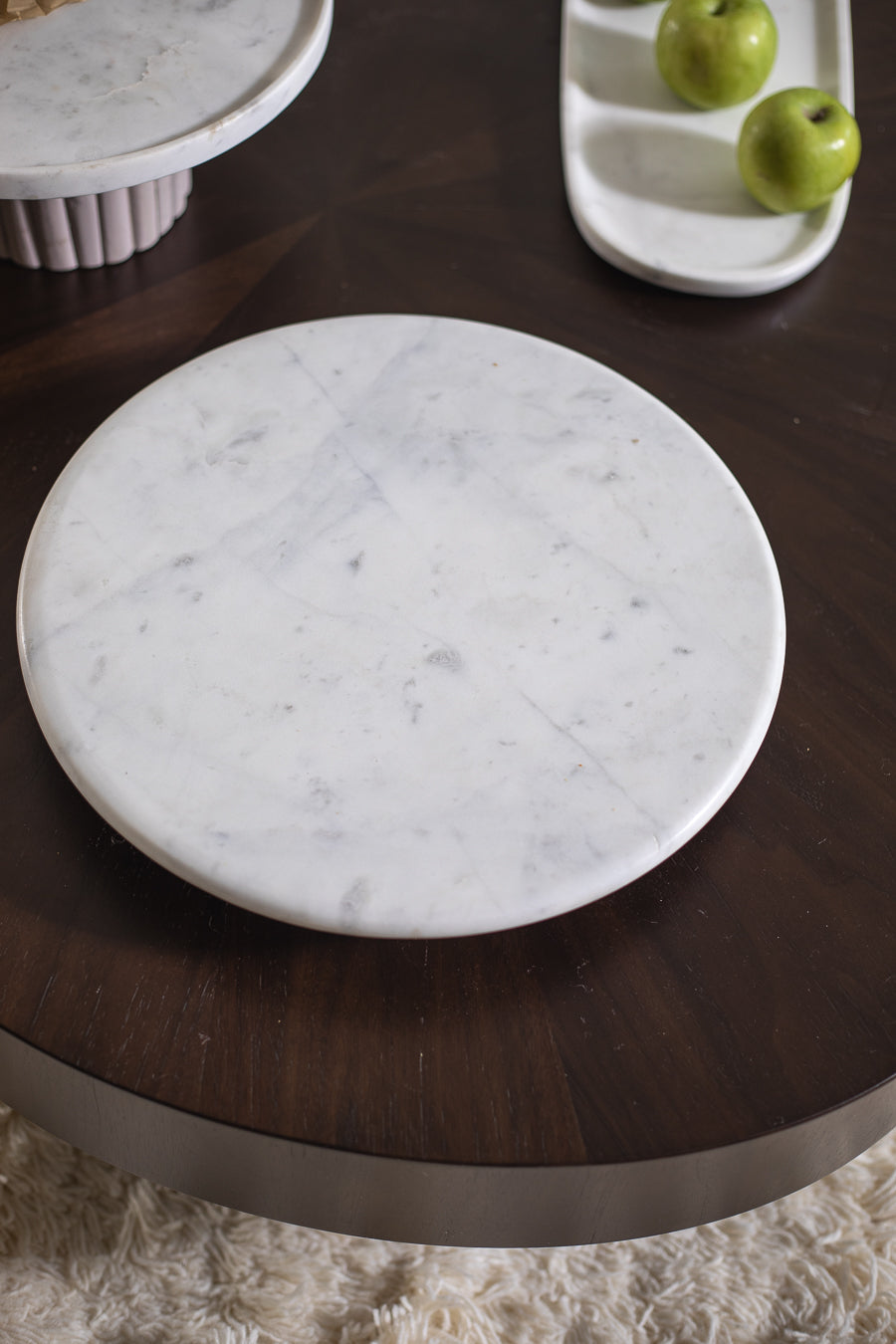 מגש מארבל במרקם שיש לבן. מגש אירוח מסתובב עגול, בגימור חלק ונוכחות בחומר.