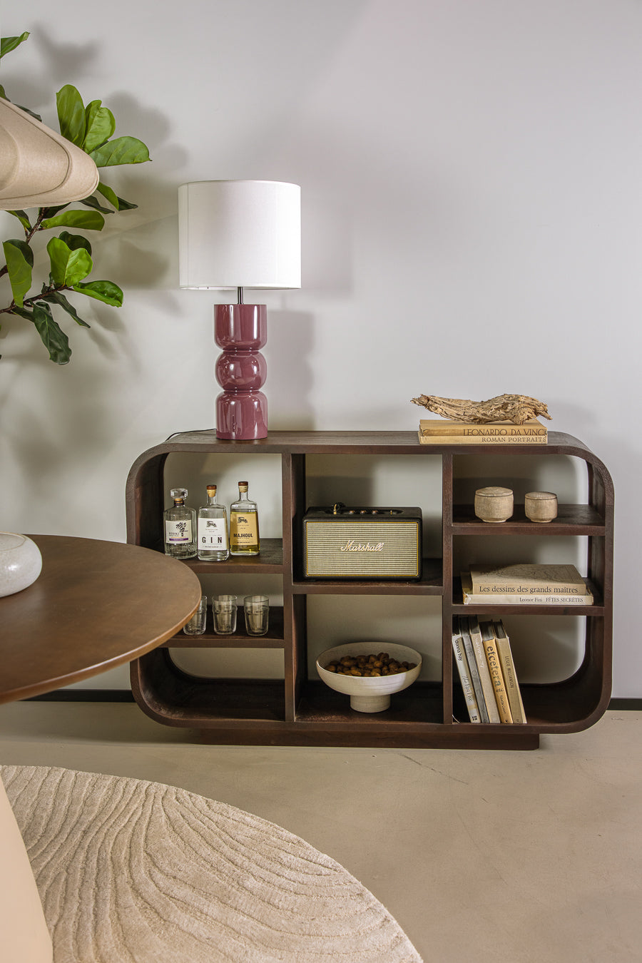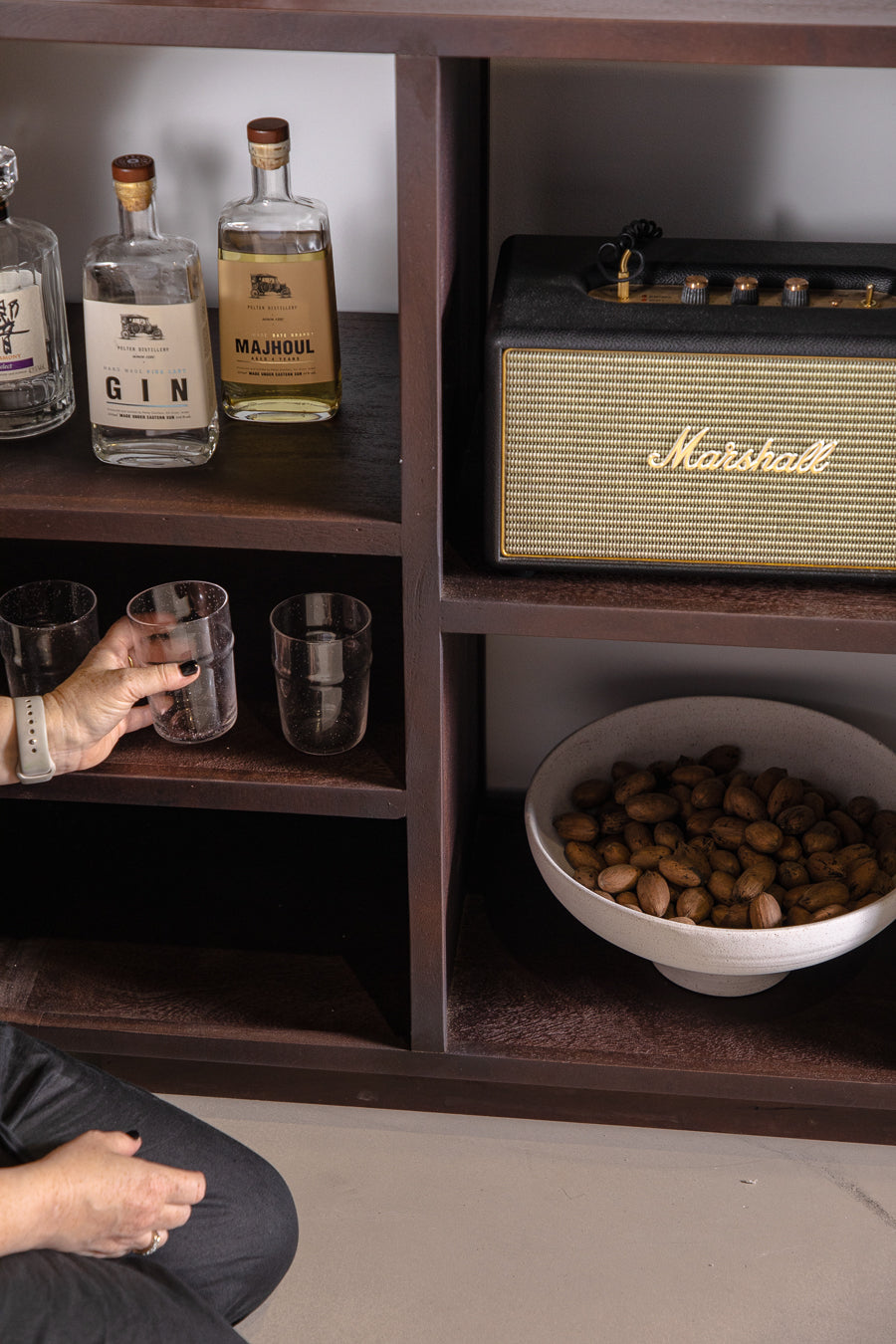 יחידת מידוף עץ מנגו בגוון עץ טבעי. כוננית מדפים רוחבית, מעוצבת 8 חללי תצוגה בגובה משתנה.