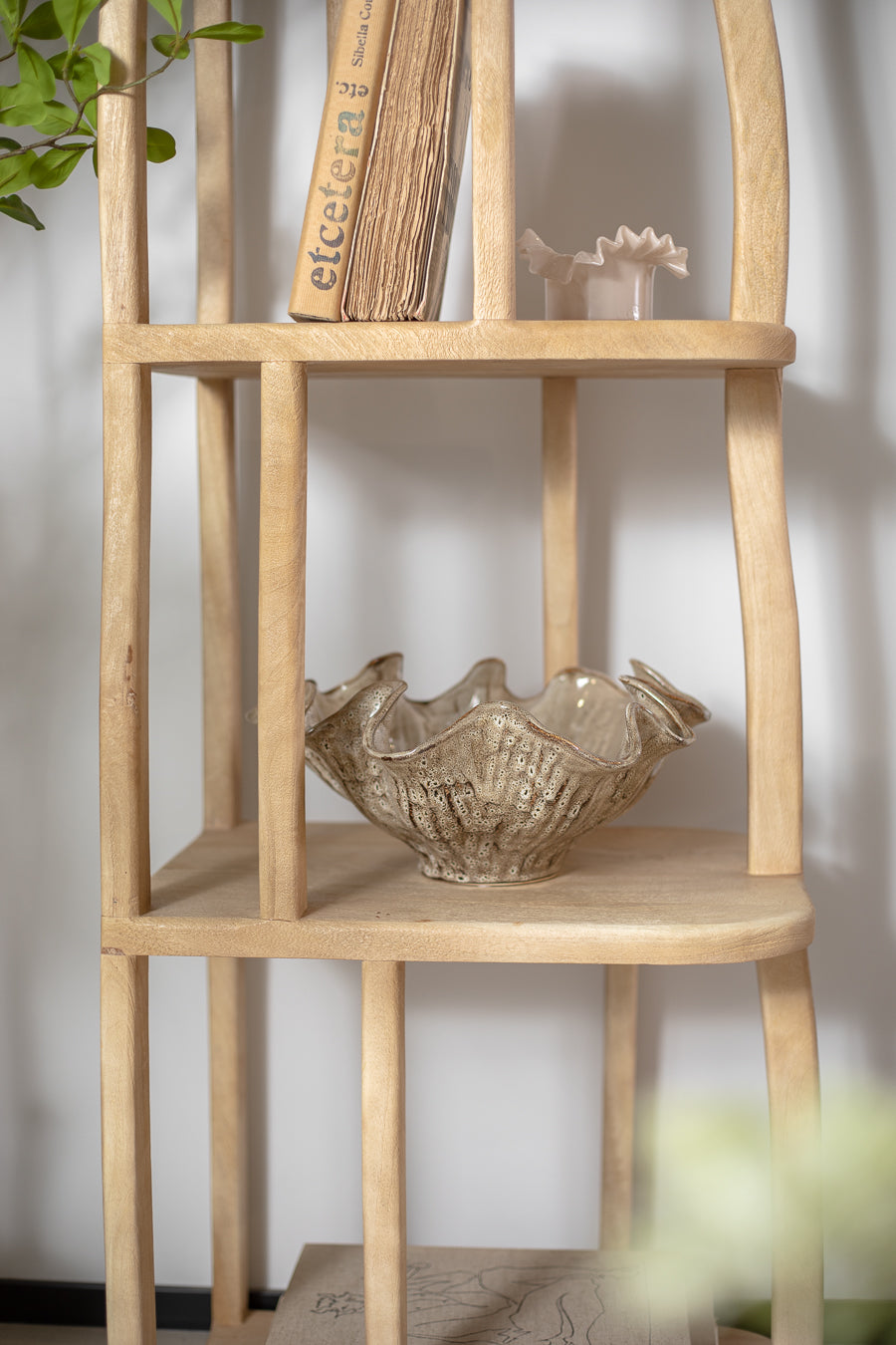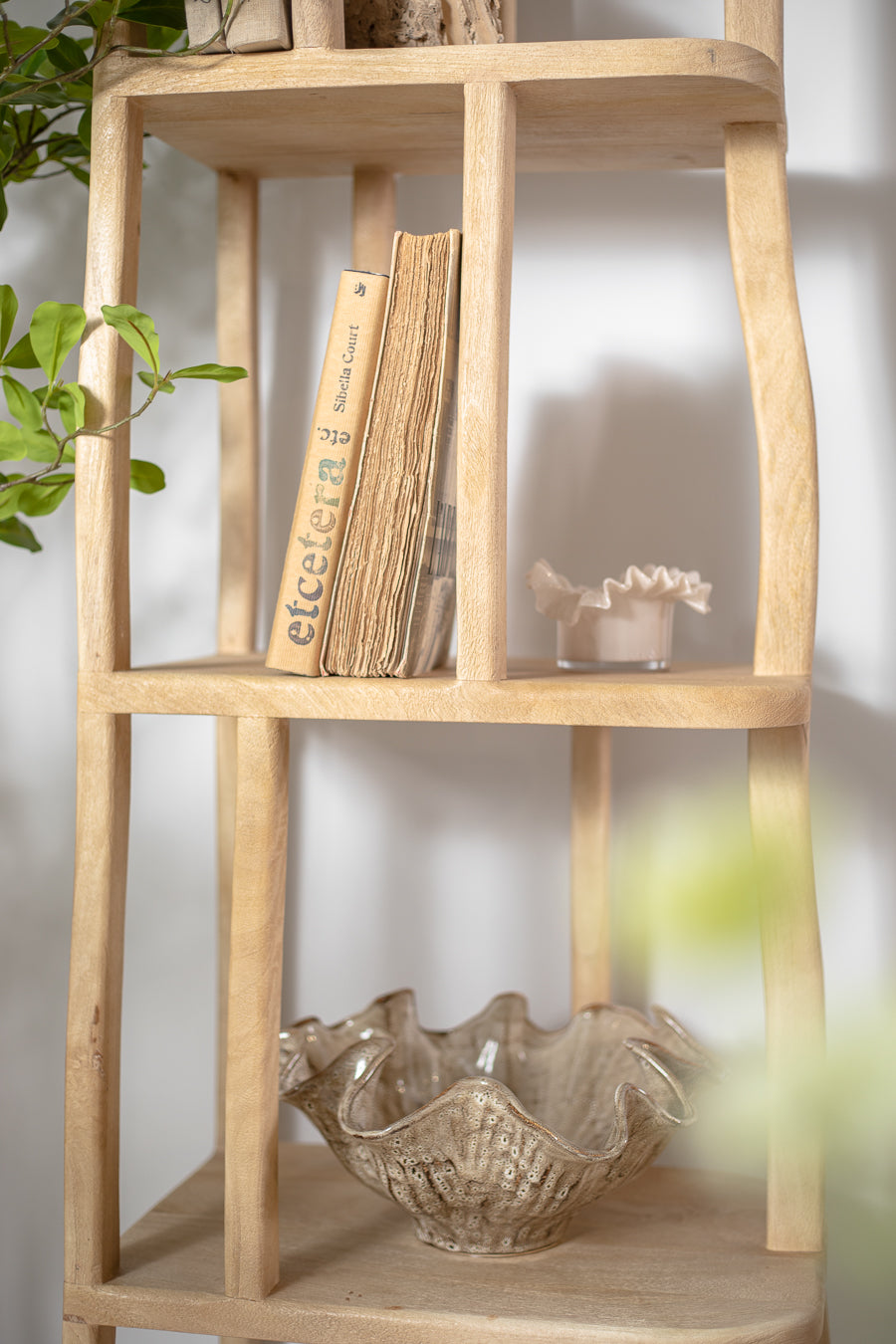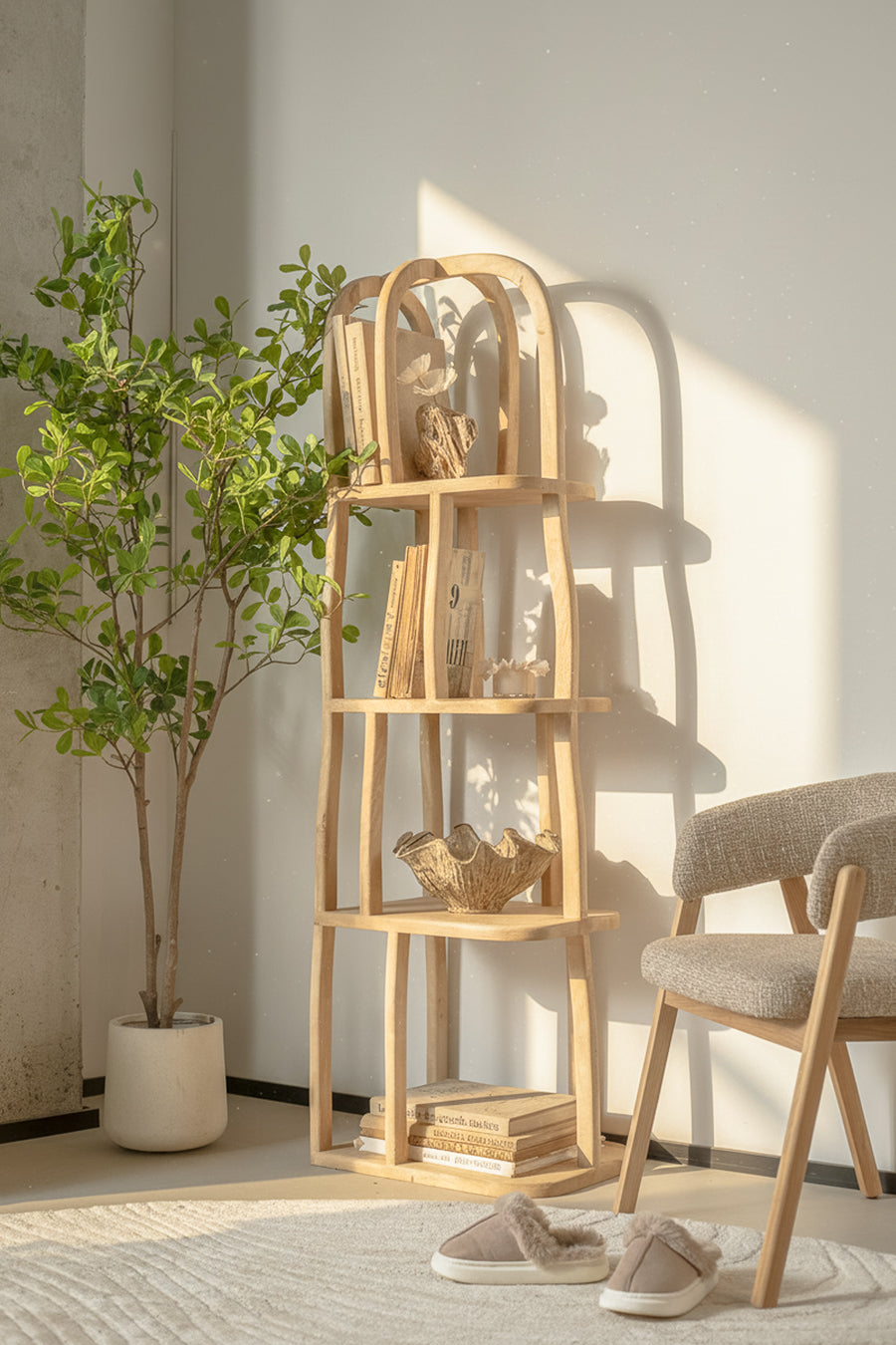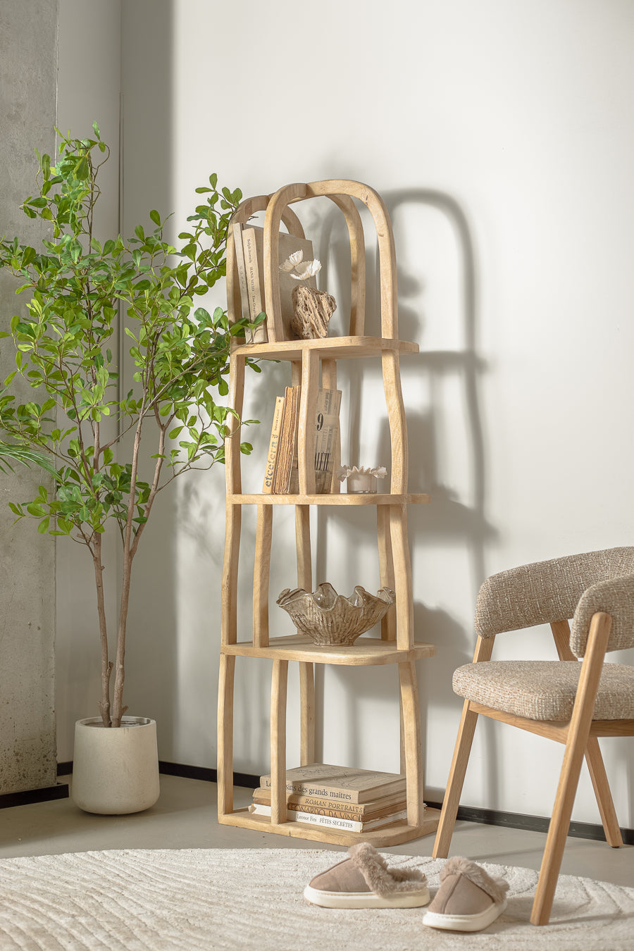 מדפים פרימיטיב בגוון עץ טבעי. כוננית ספרים נישאת בעיצוב ייחודי ושובר מוסכמות.
