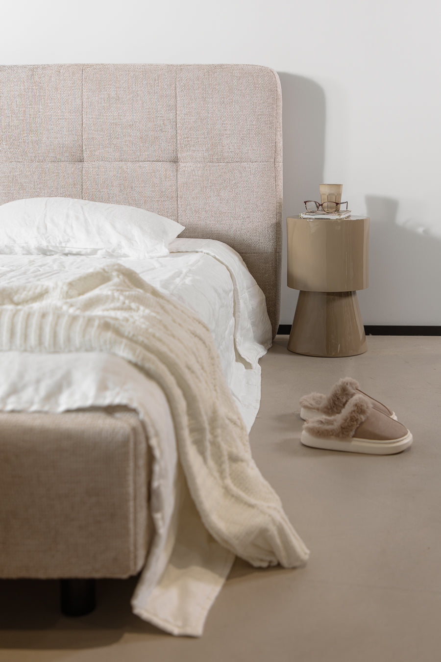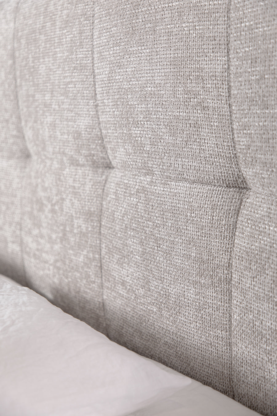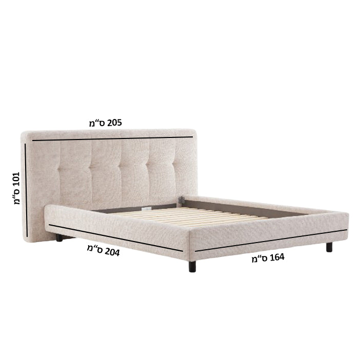 מיטה פיבי קווין סייז בגוון בהיר. מיטת חדר שינה מעוצבת ראש מיטה מלבני מרופד ונוכח.
