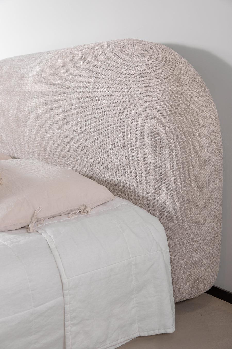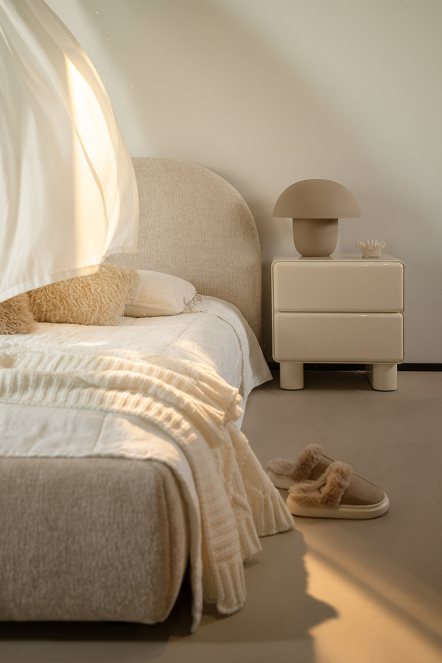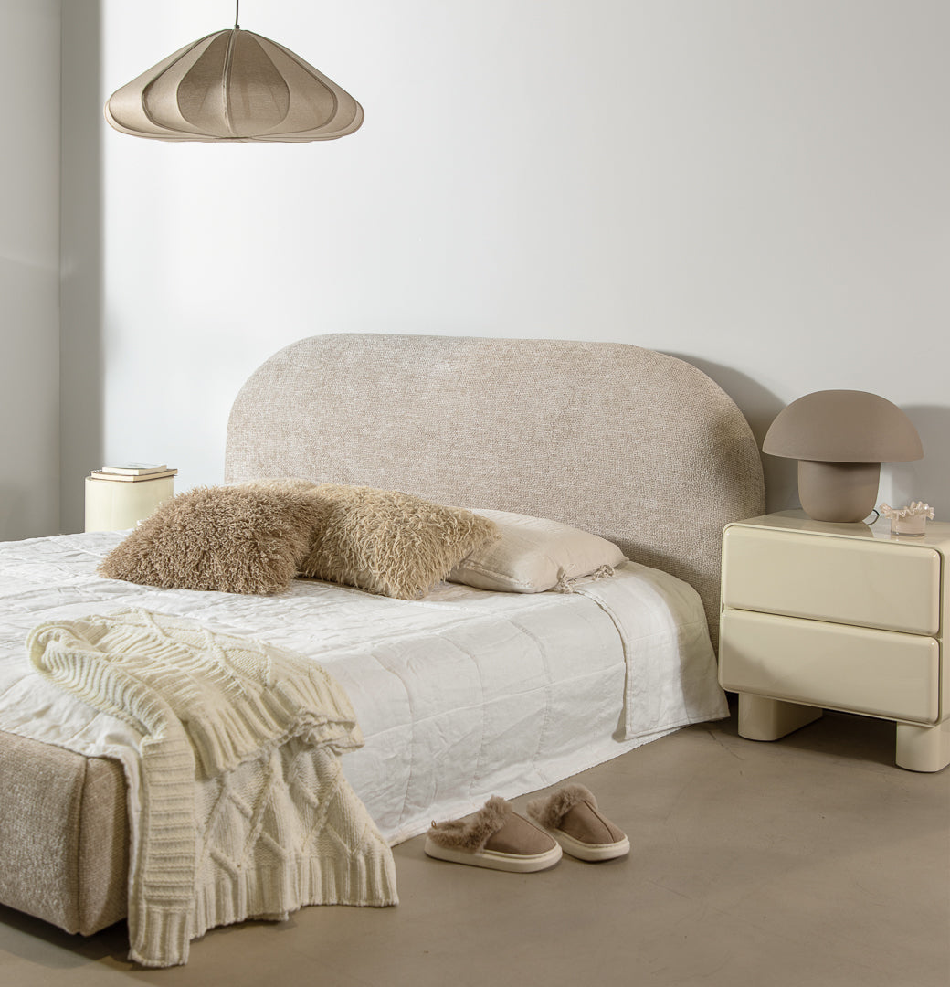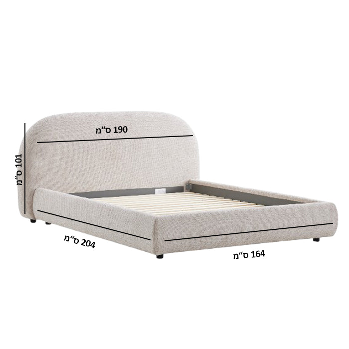 מיטה קלואי קווין סייז בגוון בהיר. מיטת חדר שינה מעוצבת ראש מיטה מעוגל ומרופד אריג בגוון הרמוני.