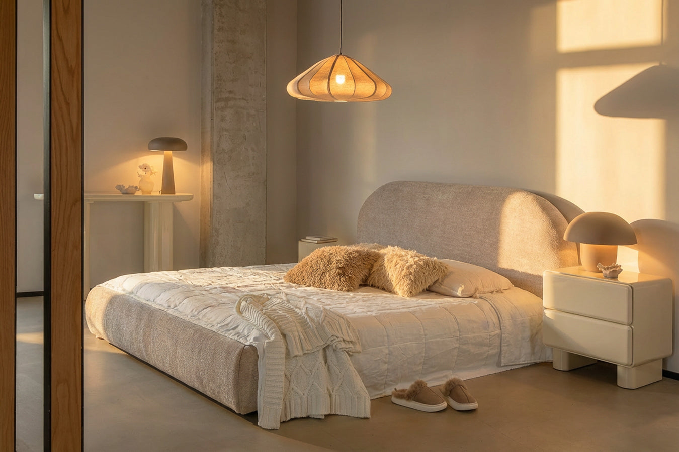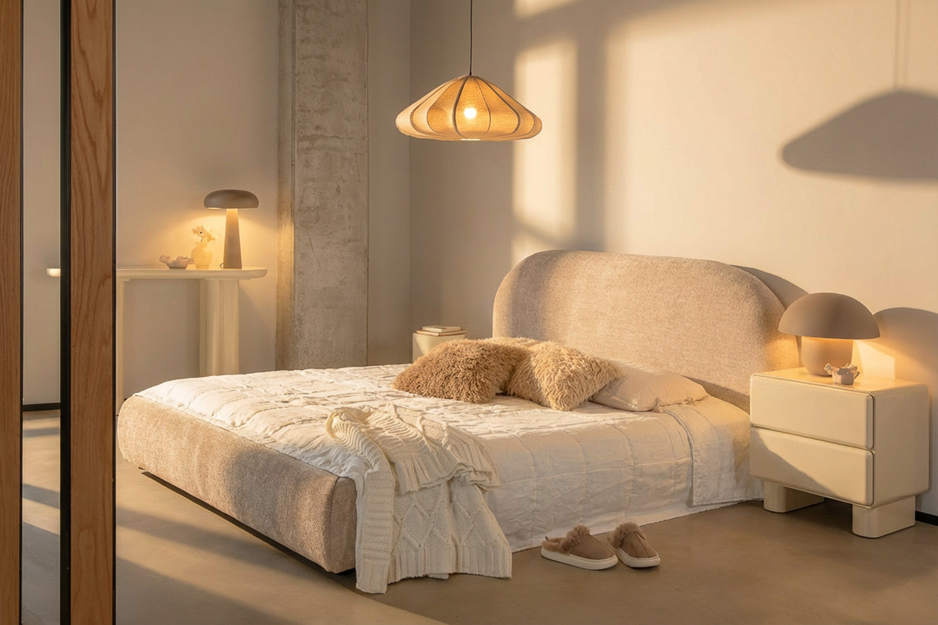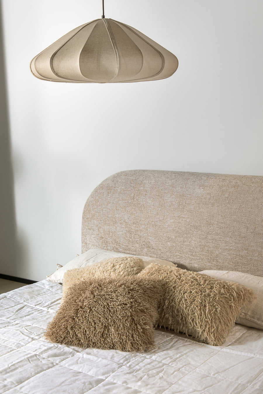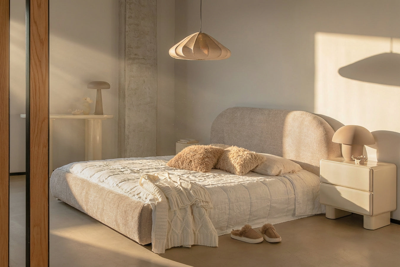 מיטה קלואי קווין סייז בגוון בהיר. מיטת חדר שינה מעוצבת ראש מיטה מעוגל ומרופד אריג בגוון הרמוני.