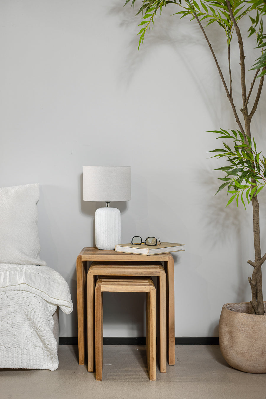 מנורת שולחן אדיסון שיק בצבע לבן. גוף תאורה מחורץ לאורכו בשילוב אהיל עגול, המשלים לנראות FINE.