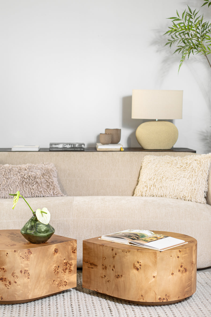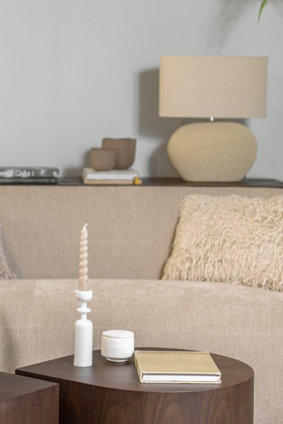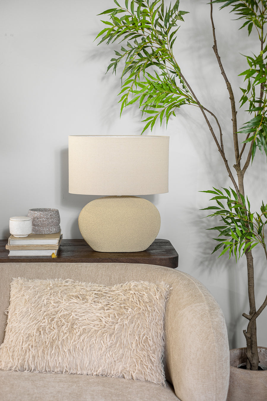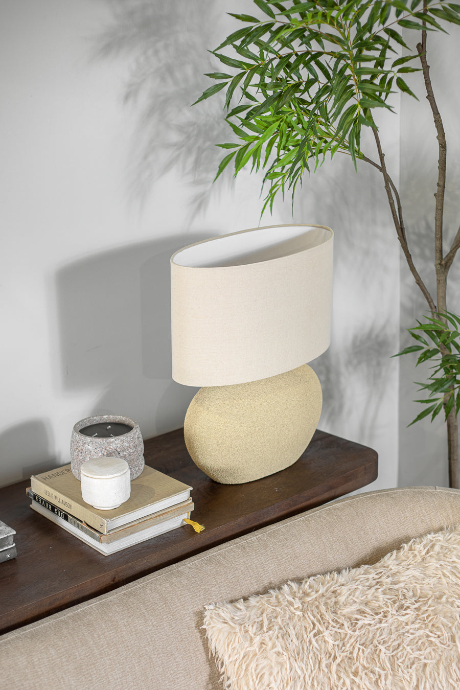 מנורת שולחן אדיסון שיק אובלית בגוון חום. גוף תאורה מעוצב גוף קרמיקה פרופיל אליפטי ו-אהיל ב-קו זהה.